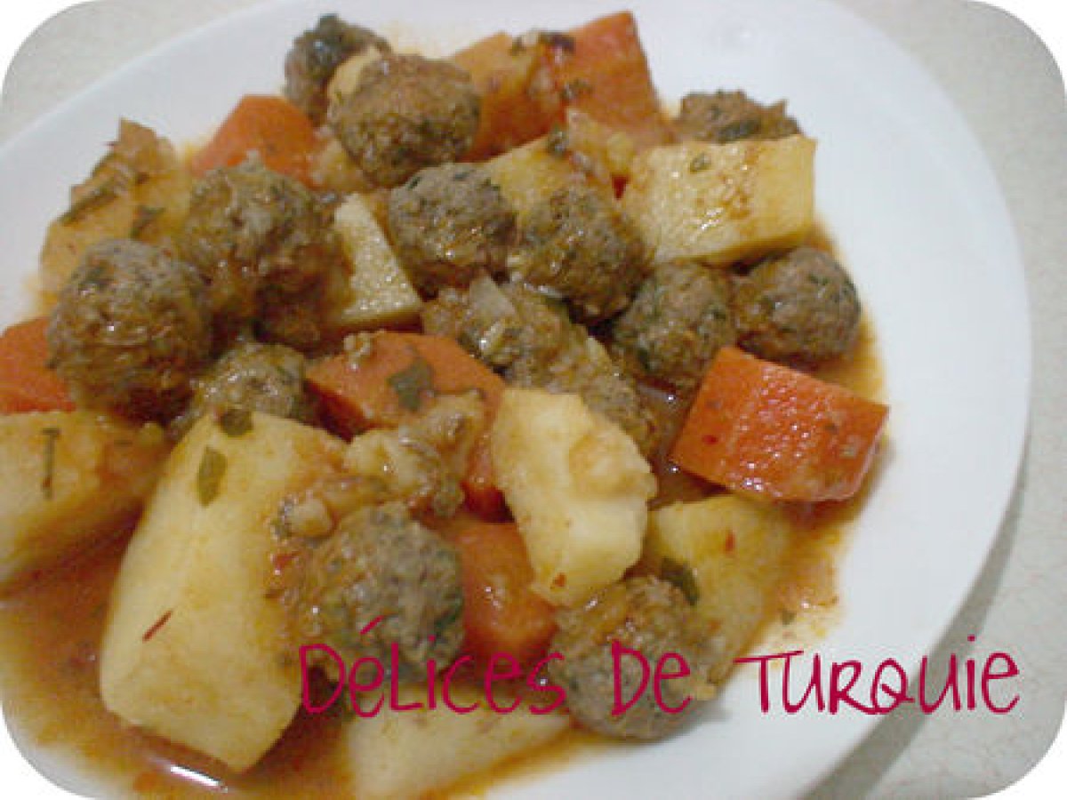 Boulettes de viande et pommes de terre en sauce - patatesli sulu köfte PrécédentSuivant Platfacile1 heure375 Kcal Envoyer cette recette à un ami Imprimer cette page Poser une question à l'auteur Publier votre photo de cette recette Ingrédients 6 500 g viande hachée non grasse 2 oignons 1 kg pommes de terre 3 carottes 2 gousses d'ail 5 cuillères à soupe persil 3 cuillères à café concentré de tomates 2 cuillères à café mélange d'épices à köfte 1 filet d'huile d'olive sel poivre Coût estimé: 9.12Euros€ (1.52€/part)