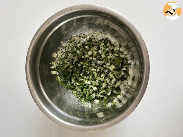 Couper l'oignon finement, presser la gousse d'ail à l'aide d'un presse-ail ou la couper en petits morceaux.