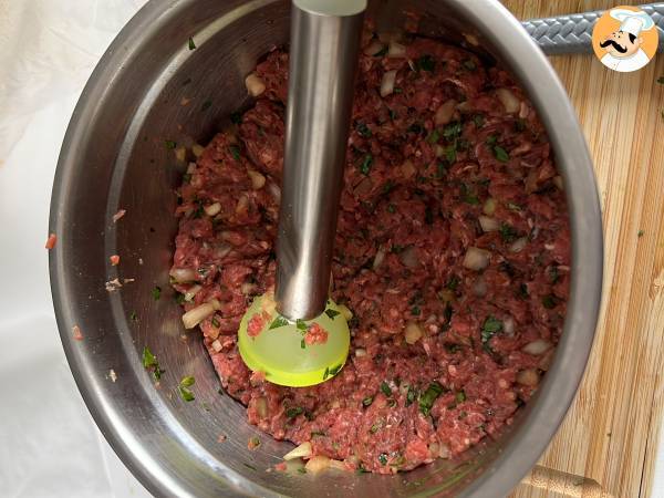 Placer la viande hachée dans un grand bol et ajouter l'oignon, l'ail et le persil, assaisonner de sel et de poivre.