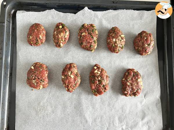 Façonner environ 10 boulettes de viande ovales les placer au réfrigérateur pendant 30 minutes.