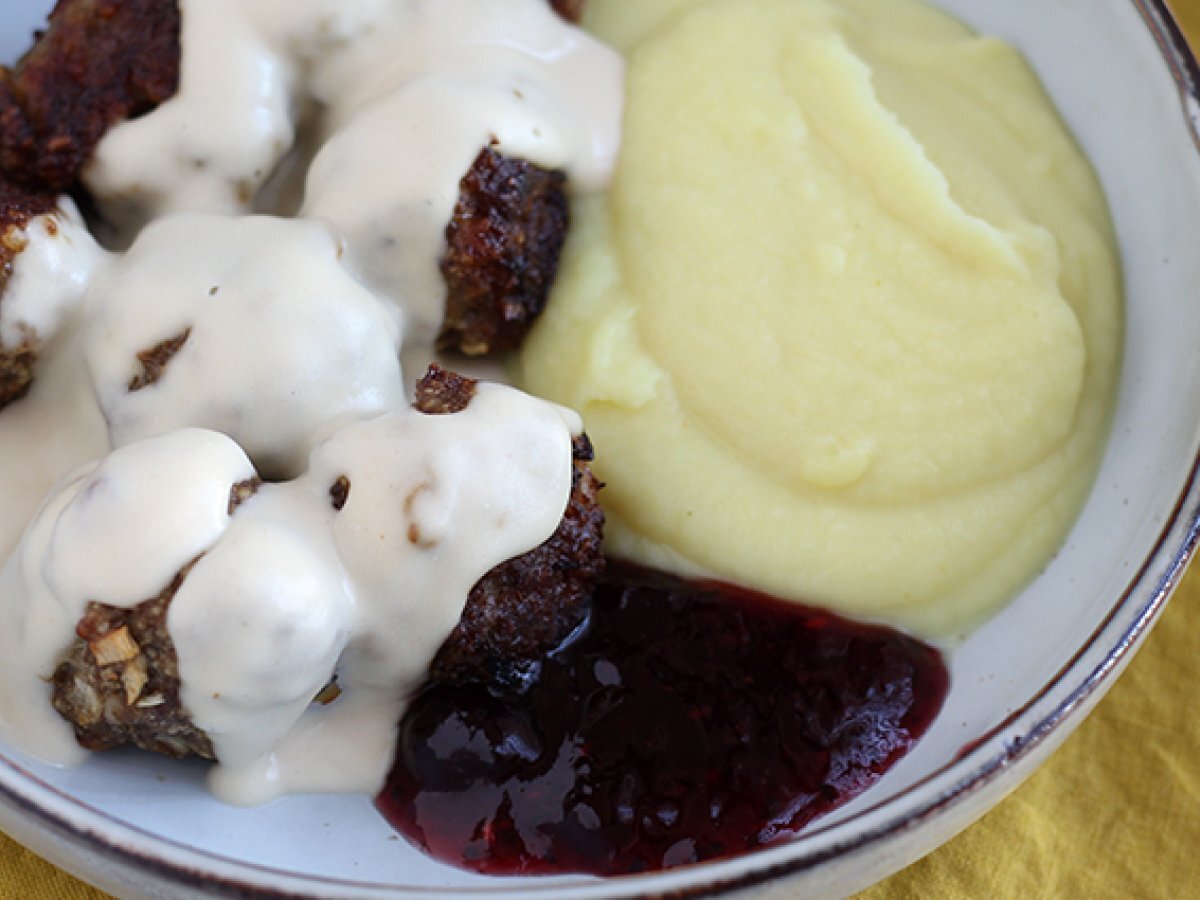Servir les boulettes accompagnées de sauce sur le dessus avec de la purée de pommes de terre et de la confiture de fruits rouges.