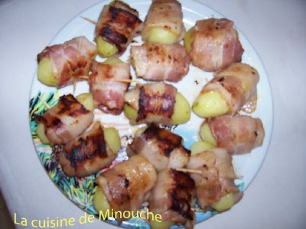 Brochette de pommes de terre au lard votez maintenant Platfacile30 min Envoyer cette recette à un ami Imprimer cette page Poser une question à l'auteur Publier votre photo de cette recette Ingrédients 2 24 pommes de terres (type Charlotte) 12 tranches de lard fumé 2 cuillères à café café de miel 3 cuillères à café soupe de beurre fondu Bouillon : 1 l de bouillon de boeuf 1 branche de thym 1 feuille de lauirer 1 oignon piqué de 3 clous de girofle Sauce : 2 cuillères à café soupe de ketchup 1 cuillère à café de concentré de tomate 3 gouttes de tabasco 20 g de beurre