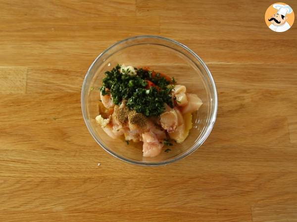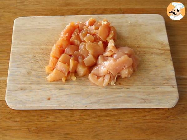 Coupez les blancs de poulet en morceaux (pensez bien à la taille qu'ils feront sur vos brochettes).