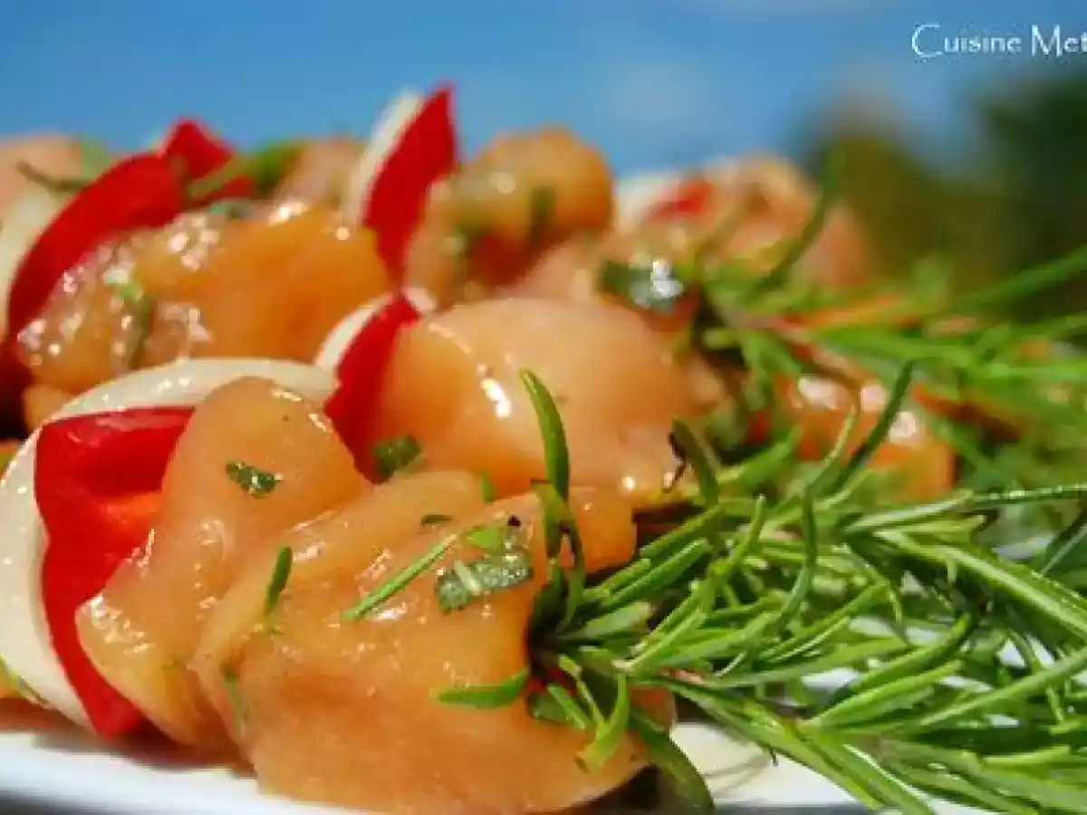 Brochettes de poulet au romarin et à la sauge, comme chez gracianne votez maintenant PrécédentSuivant Platfacile30 min199 Kcal Envoyer cette recette à un ami Imprimer cette page Poser une question à l'auteur Publier votre photo de cette recette Ingrédients 4 400 g de blancs de poulet 8 belles tiges de romarin d'une vingtaine de centimètres 1 poignée de feuilles de sauge fraîche 1 poivron rouge 1 bel oignon 2 cuillères à soupe de sauce soja claire 1 cuillère à soupe de sirop d'agave (ou 1 cuillère à soupe de sucre) Coût estimé: 12.68Euros€ (3.17€/part)