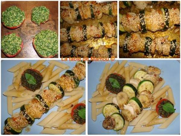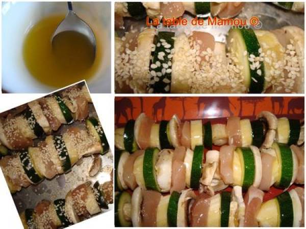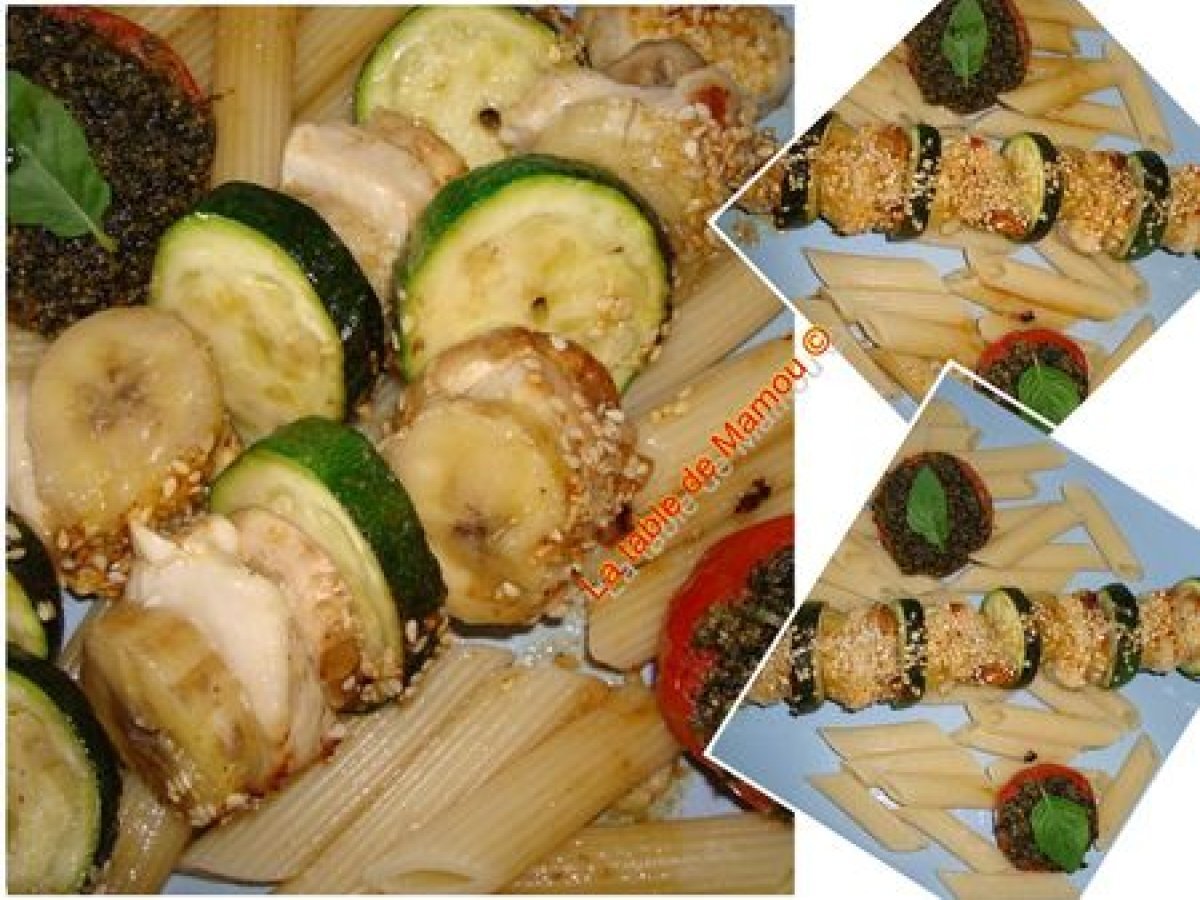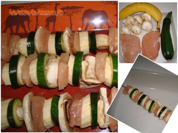 Brochettes de poulet, banane, courgette et champignons votez maintenant Platfacile35 min Envoyer cette recette à un ami Imprimer cette page Poser une question à l'auteur Publier votre photo de cette recette Ingrédients 2 2 escalopes de poulet 6 champignons de Paris 1 petite courgette 1 banane 1 cuillère à soupe de miel d'acacia 1 cuillère à soupe d'huile d'olive 1 cuillère à soupe de jus de citron 2 cuillères à soupe de sésame 2 tomates 1 craquotte, persil aïl sel poivre Pâtes