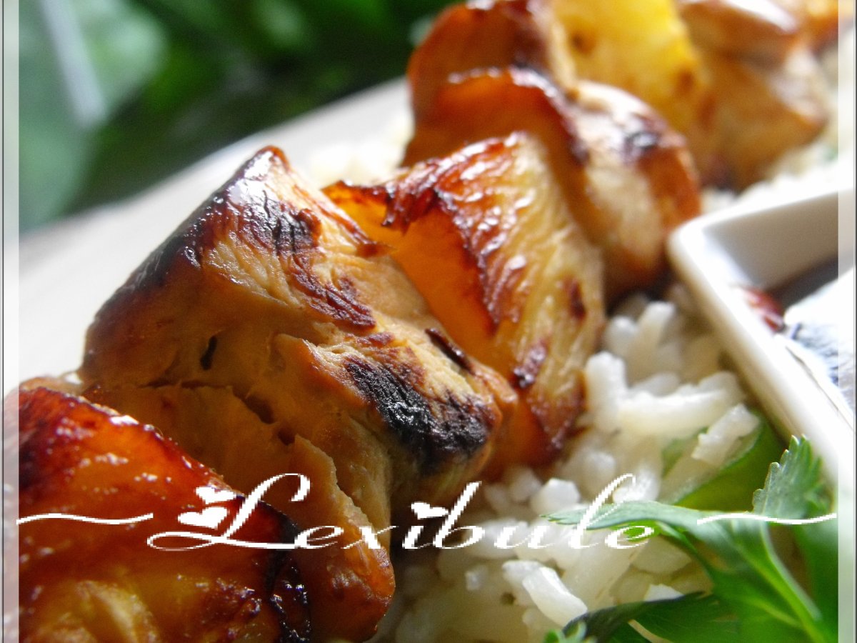 Brochettes de poulet hawaïennes avec riz à la noix de coco Platfacile35 min Envoyer cette recette à un ami Imprimer cette page Poser une question à l'auteur Publier votre photo de cette recette Ingrédients 4 ngrédients pour les brochettes 2 livres de poitrine de poulet sans os et sans peau 20 onces d'ananas en morceaux(moi ananas frais) Ingrédients pour la marinade à brochettes 3 c. à table de sauce soya 2 c. à table de xérès 1 c. à table d'huile de sésame 3 c. à table de sucre brun 1/4 de c. à thé de gingembre moulu (moi gingembre frais haché) 1/4 de c. à thé de sel d'ail (moi 2 grosses gousses d'ail hachée) Ingrédients pour la sauce à brochettes 2/3 de tasse de jus d'ananas 1/4 de tasse de vinaigre blanc (hihi.. j'avais lu vin blanc.. alors vin blanc pour moi) 2 c. à table de sauce soya 1 c. à table d'huile végétale (moi omis) 1/2 tasse de sucre blanc ( moi 1 c. à thé de cassonade) 1 c. à table de farine tout usage (moi épaissi avec de la veloutine) *Mon ajout 1/2 c. à thé de gingembre frais et 2 grosses gousses d'ail hachées) Ingrédients pour le riz 1 1/2 tasse de riz blanc non cuit (moi 3 tasses du riz Oncle Ben instantané) 1 tasse de lait de coco (moi 1 1/2 tasse) 1/4 de tasse de sucre blanc (moi omis) 1/2 lime, le jus seulement (moi toute une lime) 1 c. à thé d'huile d'olive 1 tasse de coriandre fraîche hachée 1/3 de tasse d'oignons verts hachés 1 1/2 tasse d'eau (moi bouillon de poulet) *Mon ajout: 3 gousses d'ail hachées) et sel au goût