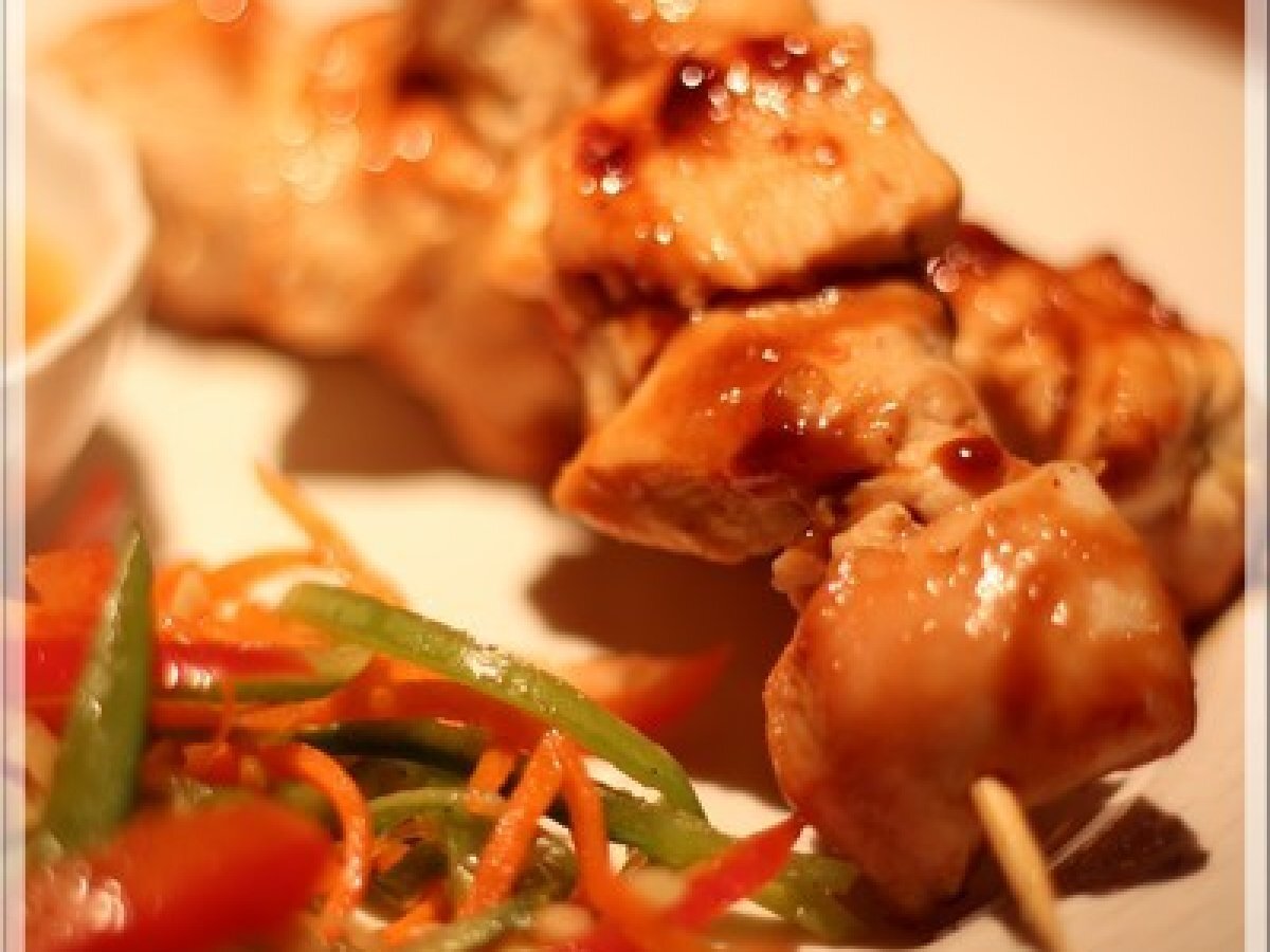 Brochettes de poulet, sauce à l'orange Platfacile32 min Envoyer cette recette à un ami Imprimer cette page Poser une question à l'auteur Publier votre photo de cette recette Ingrédients 4 450g (1 lb) de poitrines de poulet, la peau enlevée 2 petits poireaux 12 shiitakes coupés en deux (moi champignons blancs) 15 ml (1 c. à soupe) d'huile canola (moi omis, cuisson sur le B.B.Q.) Pour la sauce à l'orange 500 ml (2 tasses) de jus d'orange (moi le Tropica sans pulpes car il est plus épais et goûteux) 30 ml (2 c. à soupe) de miel (moi un peu plus) 15 ml (1 c. à soupe) de gingembre haché 15 ml (1 c. à soupe) de fécule de maïs (la prochaine fois, un peu plus) 2,5 ml (1/2 c. à thé) de sambal oelek