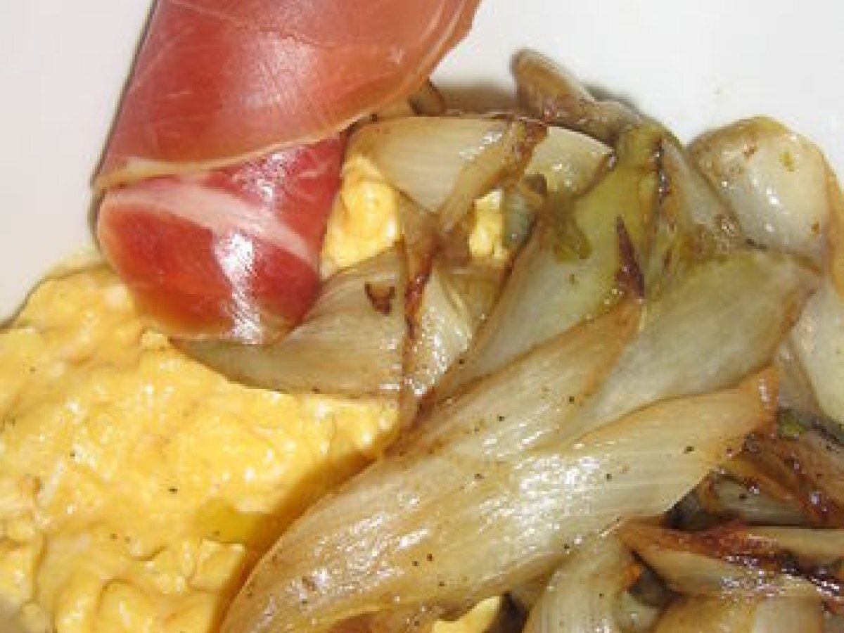 Brouillade d'endives poêlées, jambon et saint-nectaire Platmoyen30 min757 Kcal Envoyer cette recette à un ami Imprimer cette page Poser une question à l'auteur Publier votre photo de cette recette Ingrédients 2 3 endives 20 g de beurre 80 g de Saint nectaire 4 oeufs 2 tranches de jambon de bayonne 1 cuillère.à.soupe de crème 1 cuillère.à.soupe d'huile d'olive sel, poivre