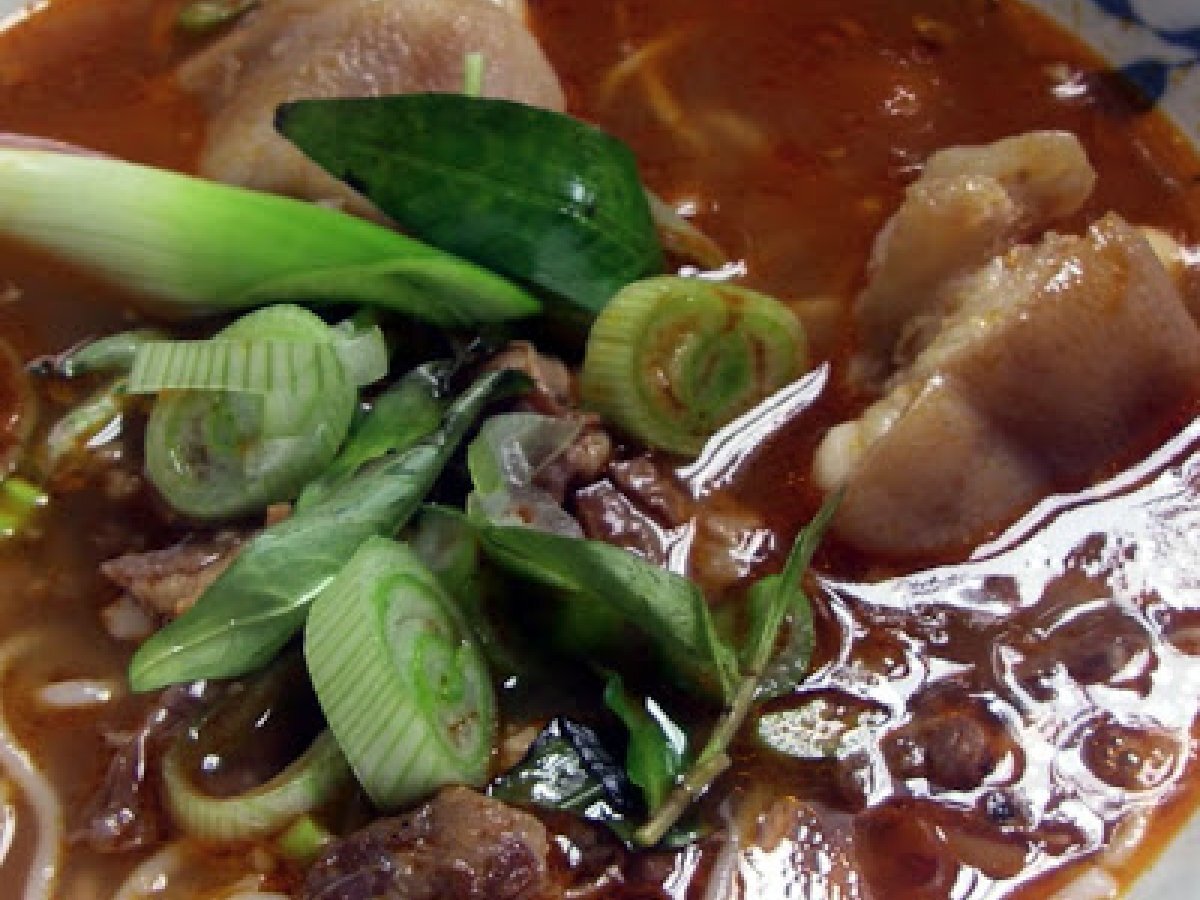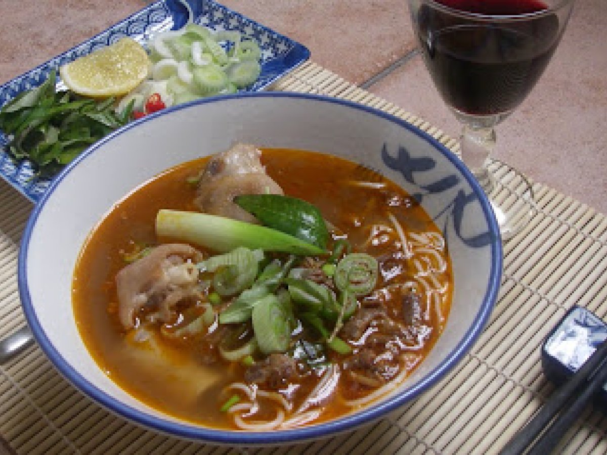 Bun bo hué - soupe de vermicelles aux pieds de porc à la façon de hué votez maintenant PrécédentSuivant Platmoyen6 heures Envoyer cette recette à un ami Imprimer cette page Poser une question à l'auteur Publier votre photo de cette recette Ingrédients 6 2 pieds de porc coupés en 6 morceaux 500 grammes de jamboneau de porc 1 Kg de plat de cotes sans os 8 tiges de citronnelle 4 cuillères à soupe (cuillerées à soupe) de Mam Ruoc 4 cuillères à café d'épices Bun Bo Hue, dans les boutique asiatiques. C'est principalement du piment, de l'ail et de graines d'annetto rouges. 2 gousses d'ail 4 gros oignons 1 bâtonnet de cannelle (3 cm de long, et une seule épaisseur) 4 échalottes vermicelles de riz, frais ou séchés. Choisir des pâtes assez épaisses. 2 tomates bien rouges Pour le service : Feuilles de Rau Ram (prononcer Rao rham), polygonum de son petit nom Eventuellement des fleurs de bananiers coupées en fines lamelles Oignons blancs Piment rouge Citron vert