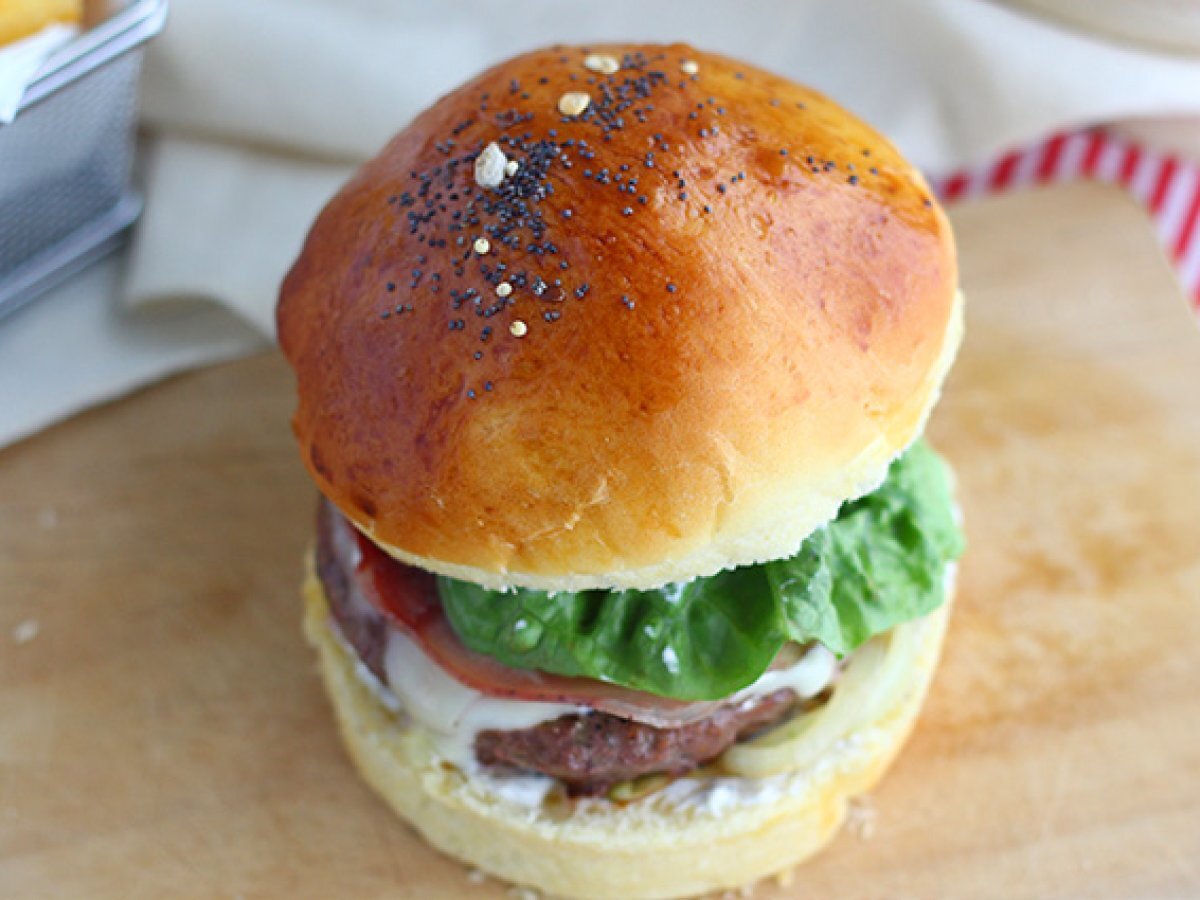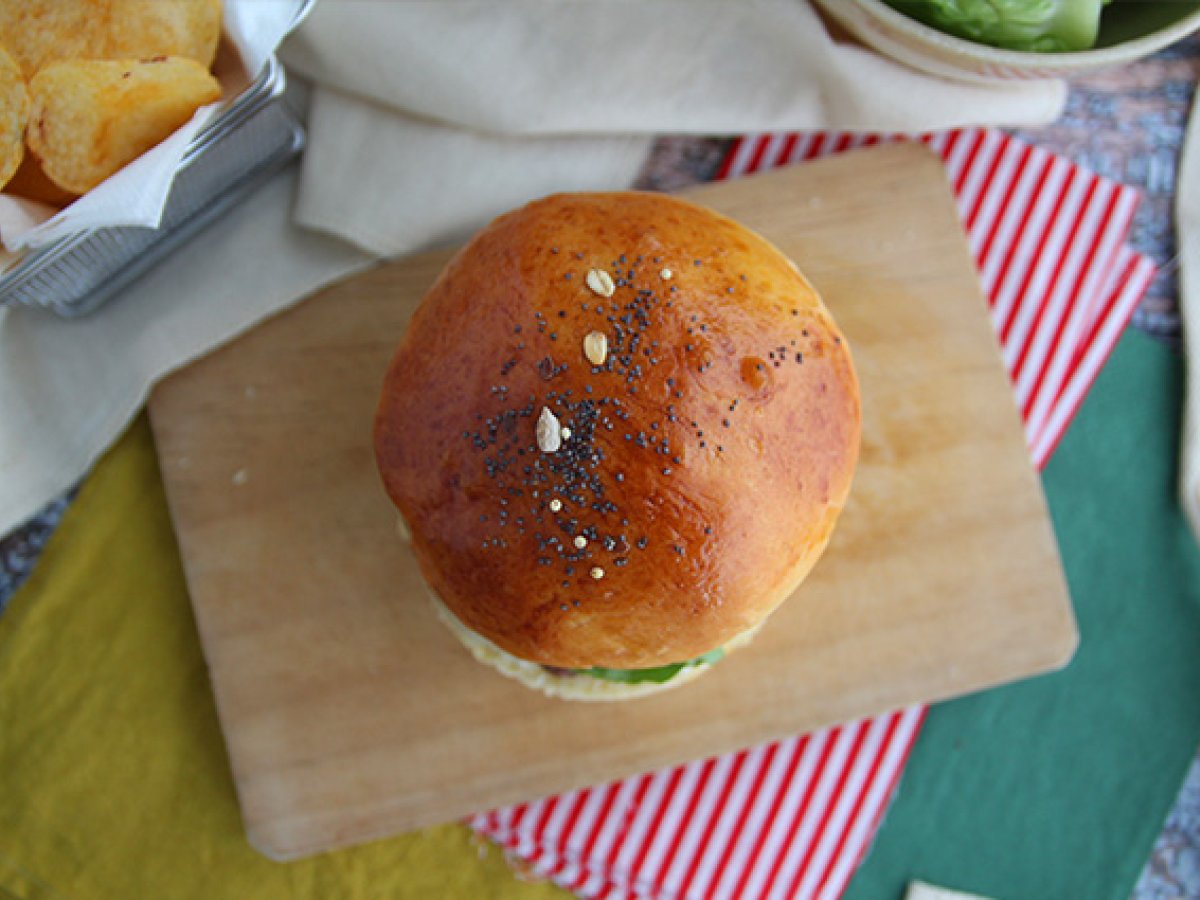 Nous avons fait un burger avec du pain frais et avons choisi de laisser le pain nature pour qu'il soit moelleux. Vous pouvez également le faire griller en les coupant en deux et en les disposant côté face intérieur sur une poêle chaude pendant quelques minutes. Votre burger sera plus croustillant.