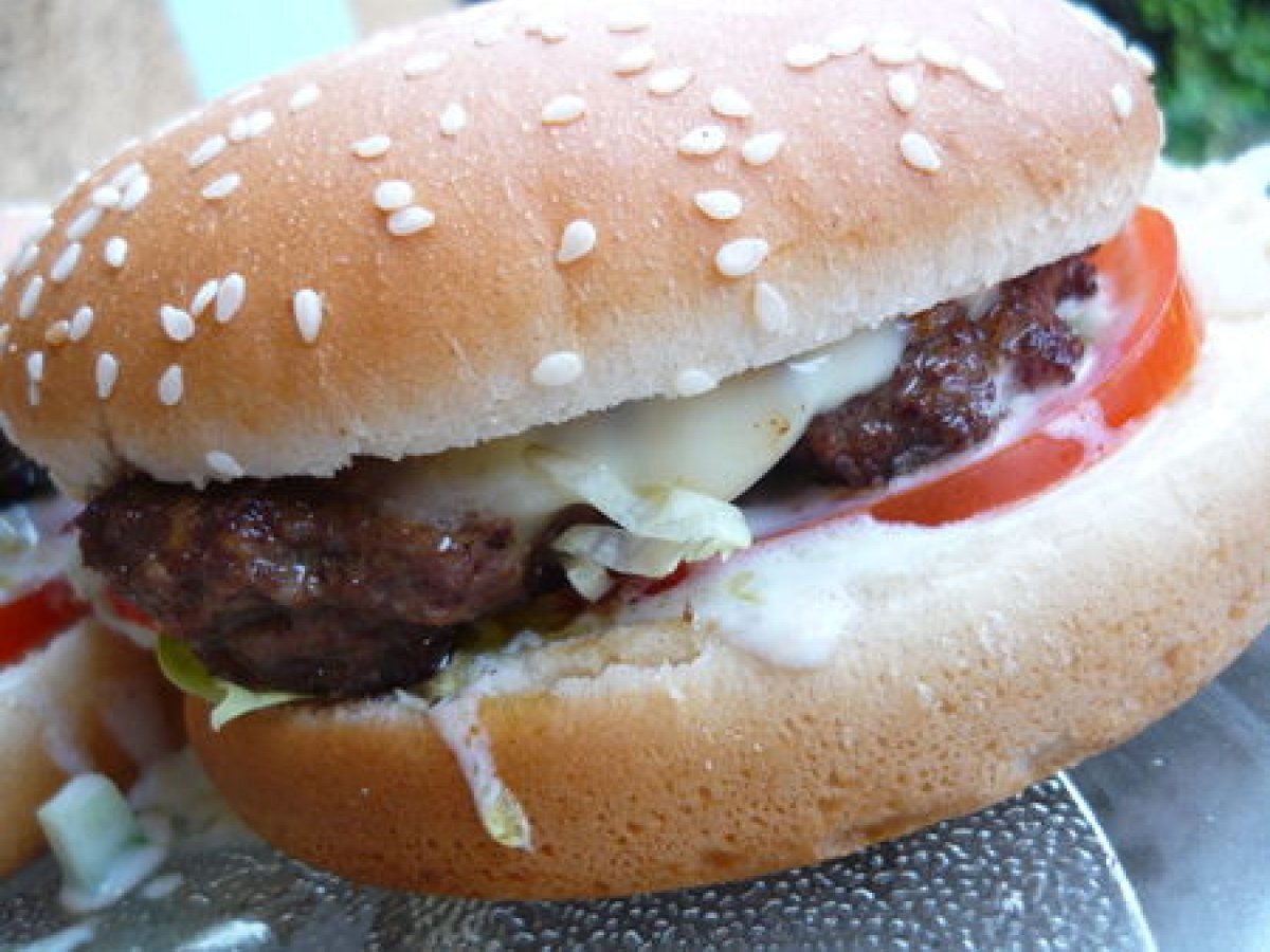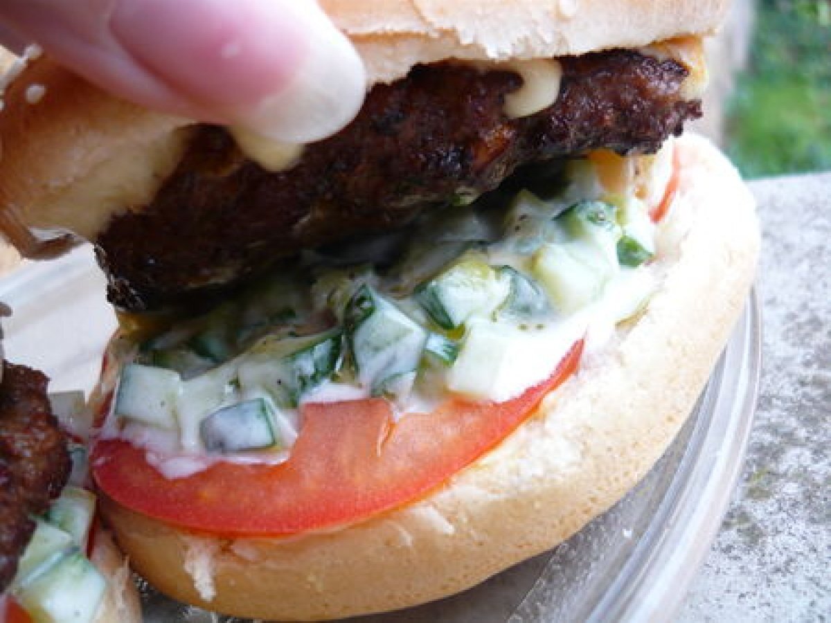 Un bon burger épicé adouci par la sauce au concombre tzatziki !