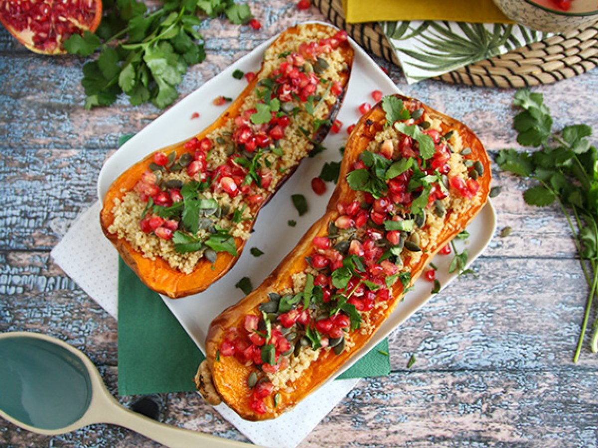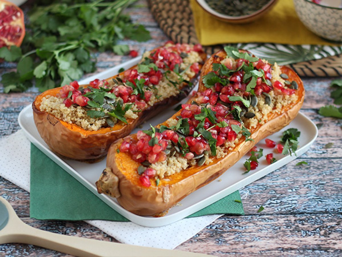 Vous avez une courge butternut et souhaitez en faire autre chose qu'un velouté ? Il est temps de la farcir ! À vous le repas complet, consistant, hivernal et coloré ! Car oui, sa chair orangée fait autant de bien à notre corps qu'à notre esprit :-) Associée au rouge des arilles de grenade et au vert de la coriandre fraîche, ce repas ravira vos papilles et vous donnera du baume au coeur :-) L'occasion de faire manger des légumes de saison à toute la famille ainsi qu'un plat végétarien et délicieux ;-) Suivez le guide pas à pas grâce à nos explications écrites, photos et vidéo !