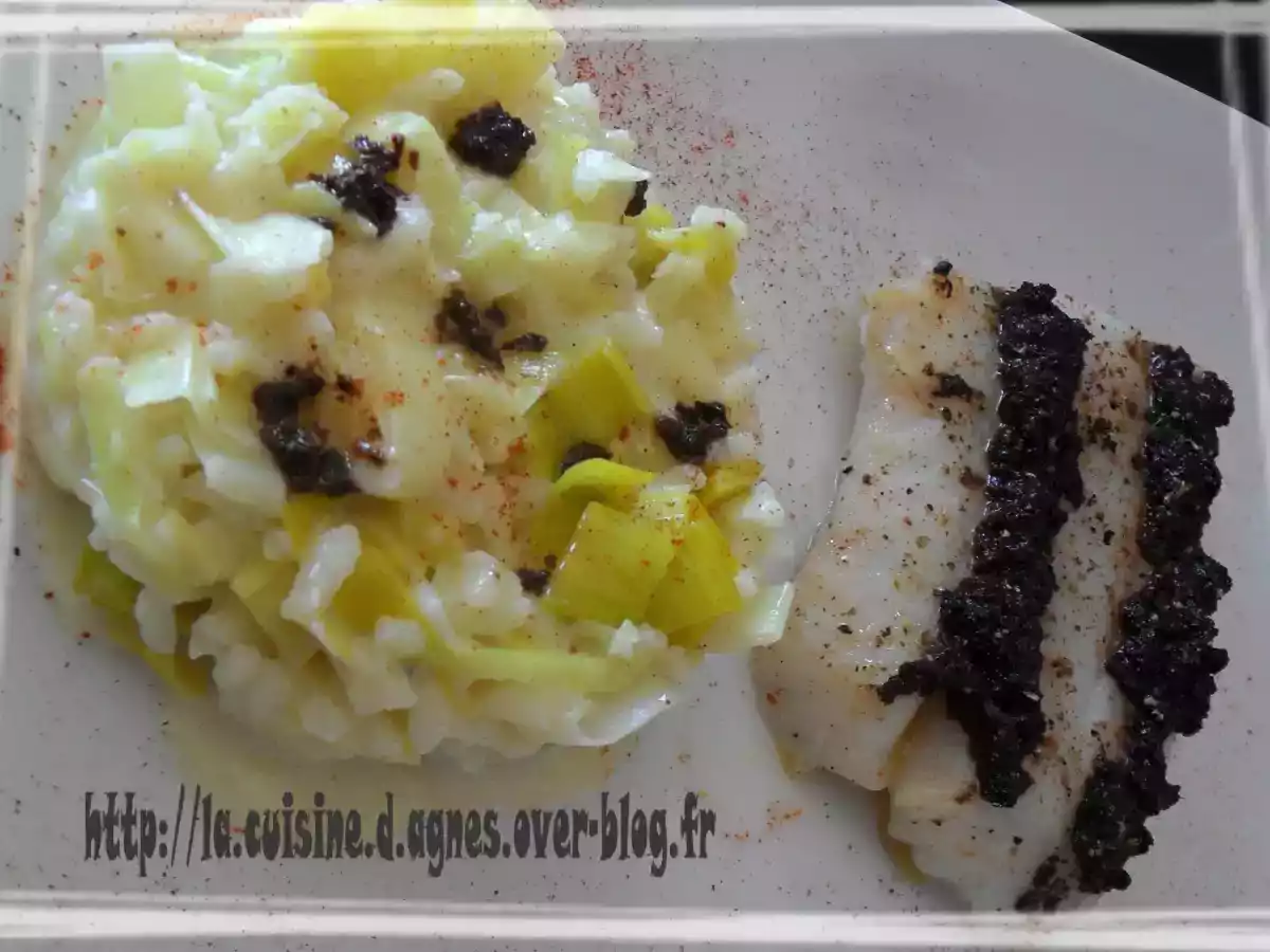Cabillaud à la tapenade et son risotto de poireaux Platmoyen35 min647 Kcal Envoyer cette recette à un ami Imprimer cette page Poser une question à l'auteur Publier votre photo de cette recette Ingrédients 4 4 pavés de cabillaud 120 g de riz à risotto 5 poireaux 25 g de beurre 75 cl de bouillon de légumes (2 cubes) 2 cuil à soupe de tapenade (2 possibilités ...CELLE achetée dans le commerce (et il y en a de très bonnes) ou la "faite" maison...ENCORE MEILLEURE (http://la.cuisine.d.agnes.over-blog.fr/article-tapenade-noire-48617951.html) 6 cuil à soupe d'huile d'olive 10 cl de crème fraiche liquide 50 g de parmesan râpé sel poivre paprika