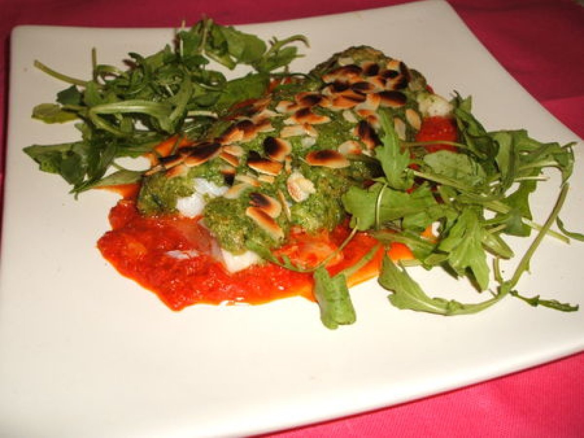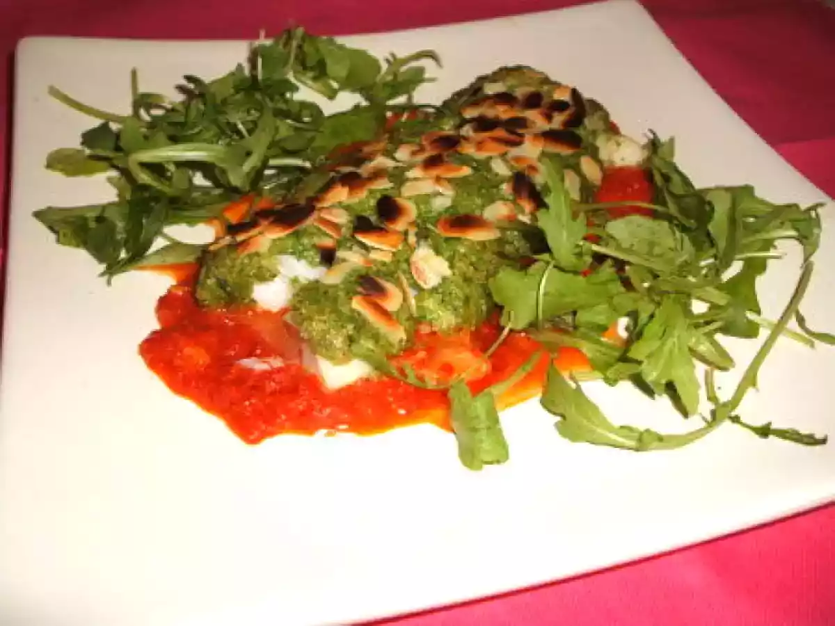 Cabillaud en croûte de pesto de roquette et amande, salsa de piquillos au citron