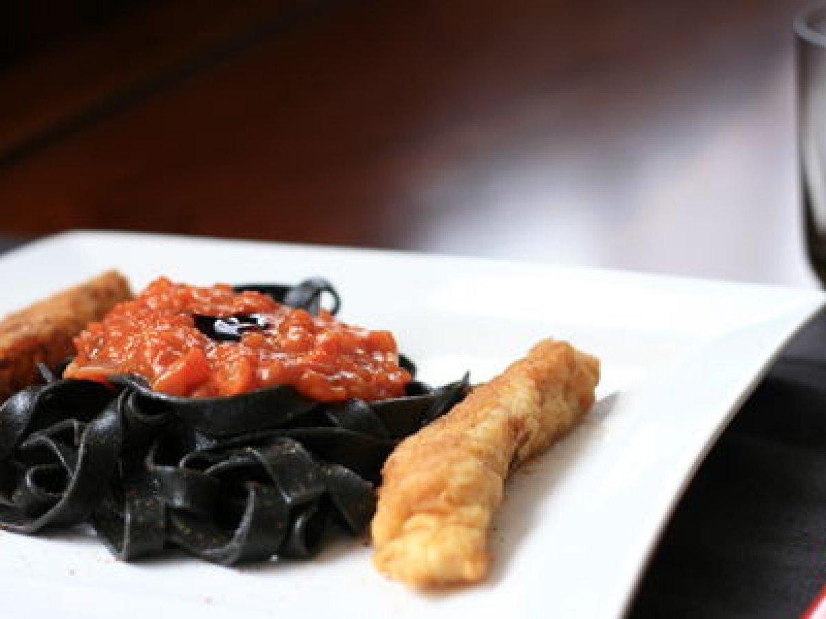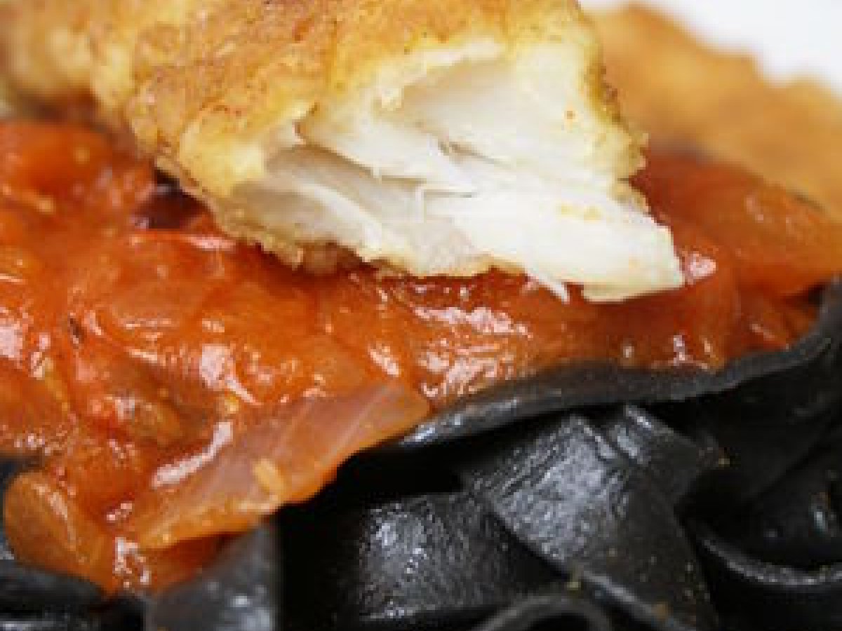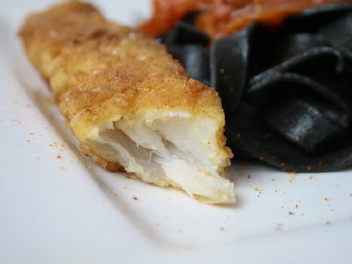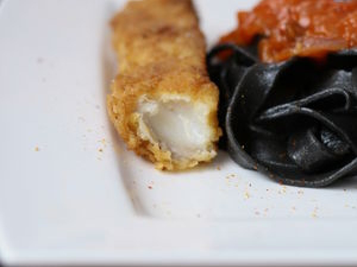 Cabillaud pané, chermoula de tomates et pâtes à l'encre de seiche