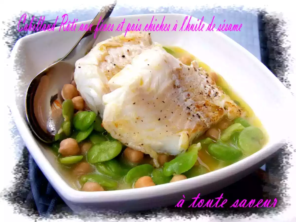 Cabillaud rôti aux fèves et pois chiches à l'huile de sésame