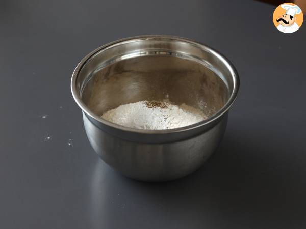 Commencer par mélanger les ingrédients secs du cake dans un grand saladier: la farine, la levure chimique et le poivre.