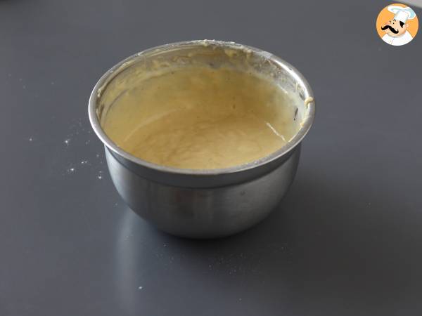 Ajouter ensuite les œufs et l'huile d'olive et bien mélanger. Verser le lait petit à petit et bien l'incorporer à la pâte.