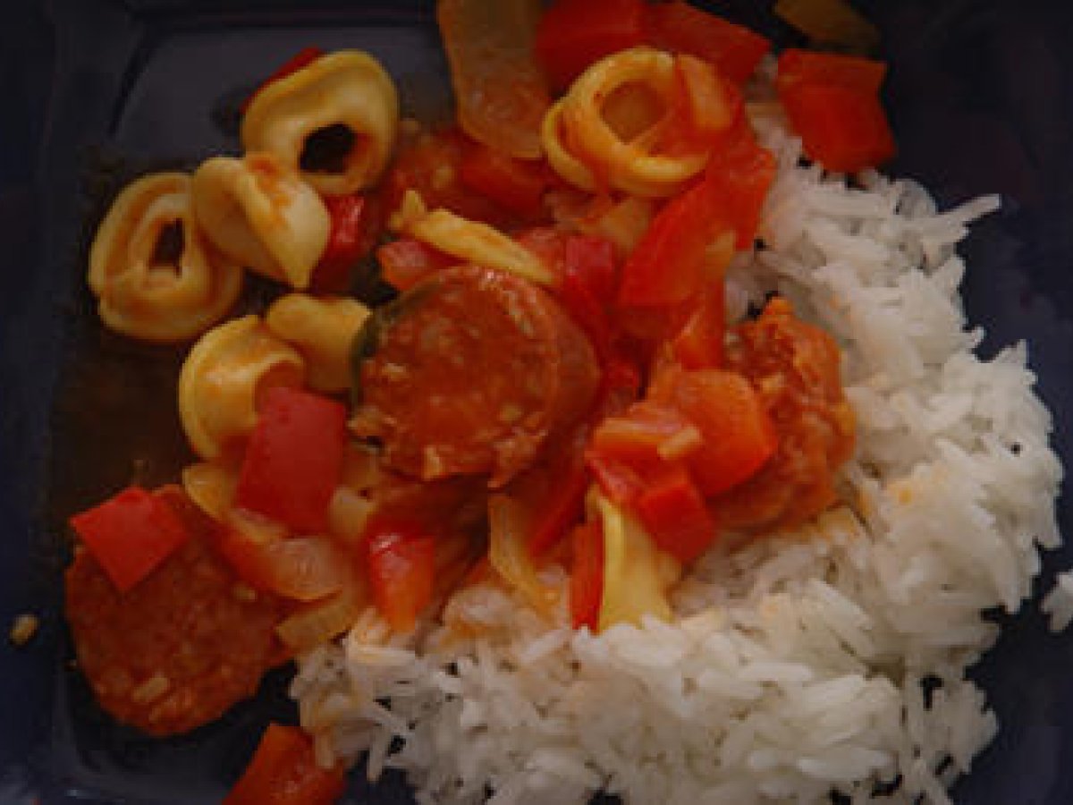 - Rajoutez une fois évaporé, les poivrons coupés en dés ou en lamelles, puis l'ail écrasé , les tomates hachées grossièrement et le chocho en tanchettes.