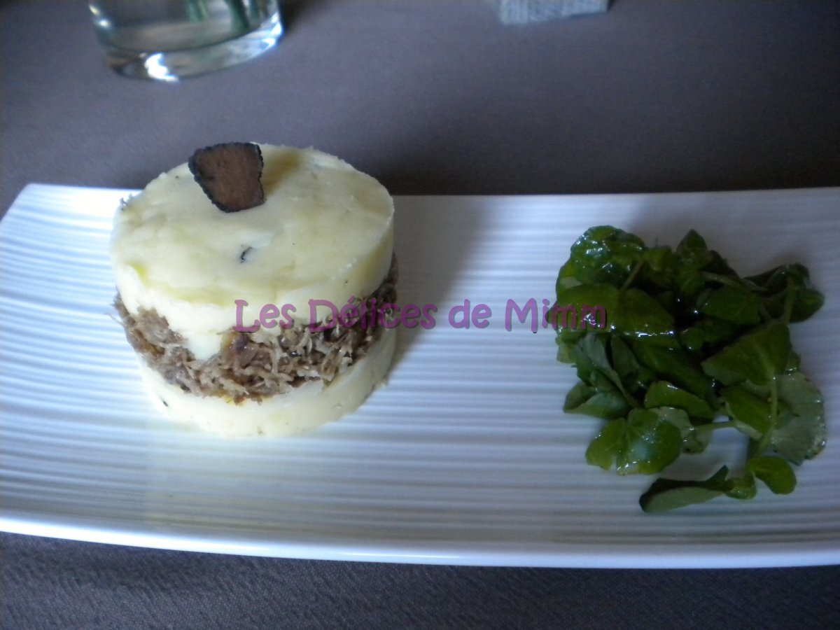 Canard confit en parmentier à la purée truffée PrécédentSuivant Platmoyen3 heures Envoyer cette recette à un ami Imprimer cette page Poser une question à l'auteur Publier votre photo de cette recette Ingrédients 2 2 cuisses de canard 2 bocaux de graisse de canard 1 gousse dail Thym, laurier Sel poivre 1 échalote 6-8 pommes de terre 50 gr de beurre 1 truffe ou des lamelles 1 bouquet de cresson 3 c à s dhuile 1 c à s de vinaigre à la pulpe de pêche de vigne