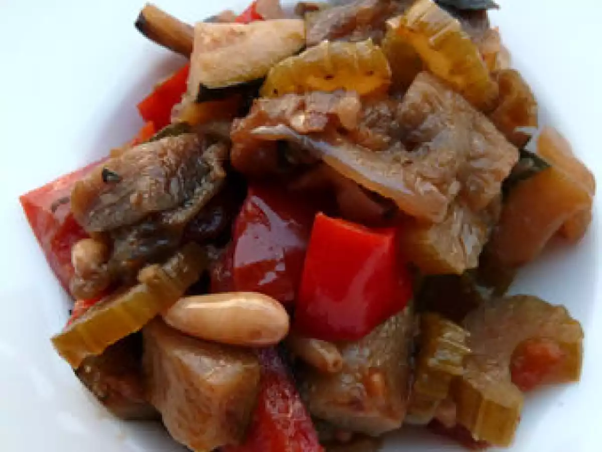 - Ajouter une bonne poignée de pignons, une de câpres, deux bonnes rasade d'un vinaigre de vin, du sel, 2 cuillères à soupe de sucre brun.