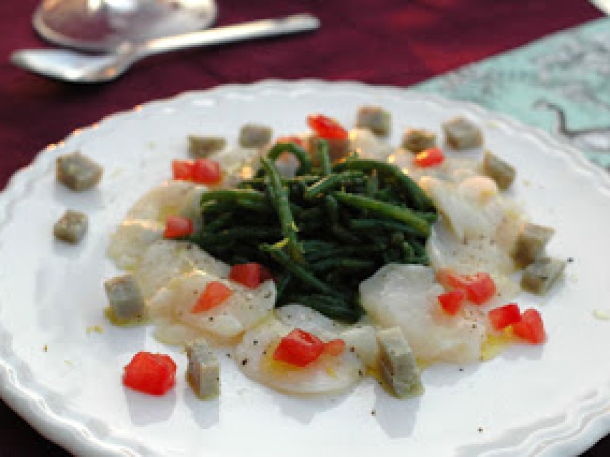Carpaccio de noix de saint-jacques et salicorne Platfacile40 min Envoyer cette recette à un ami Imprimer cette page Poser une question à l'auteur Publier votre photo de cette recette Ingrédients 4 12 à 15 noix de Saint-Jacques 1 demi citron 6 cuillères à soupe d'huile d'olive 200 g de salicorne fraîche (poissonnier) 3 cuillères à soupe de vinaigrette maison 1 gros artichaut 1 belle tomate bien mûre sel fin et poivre du moulin