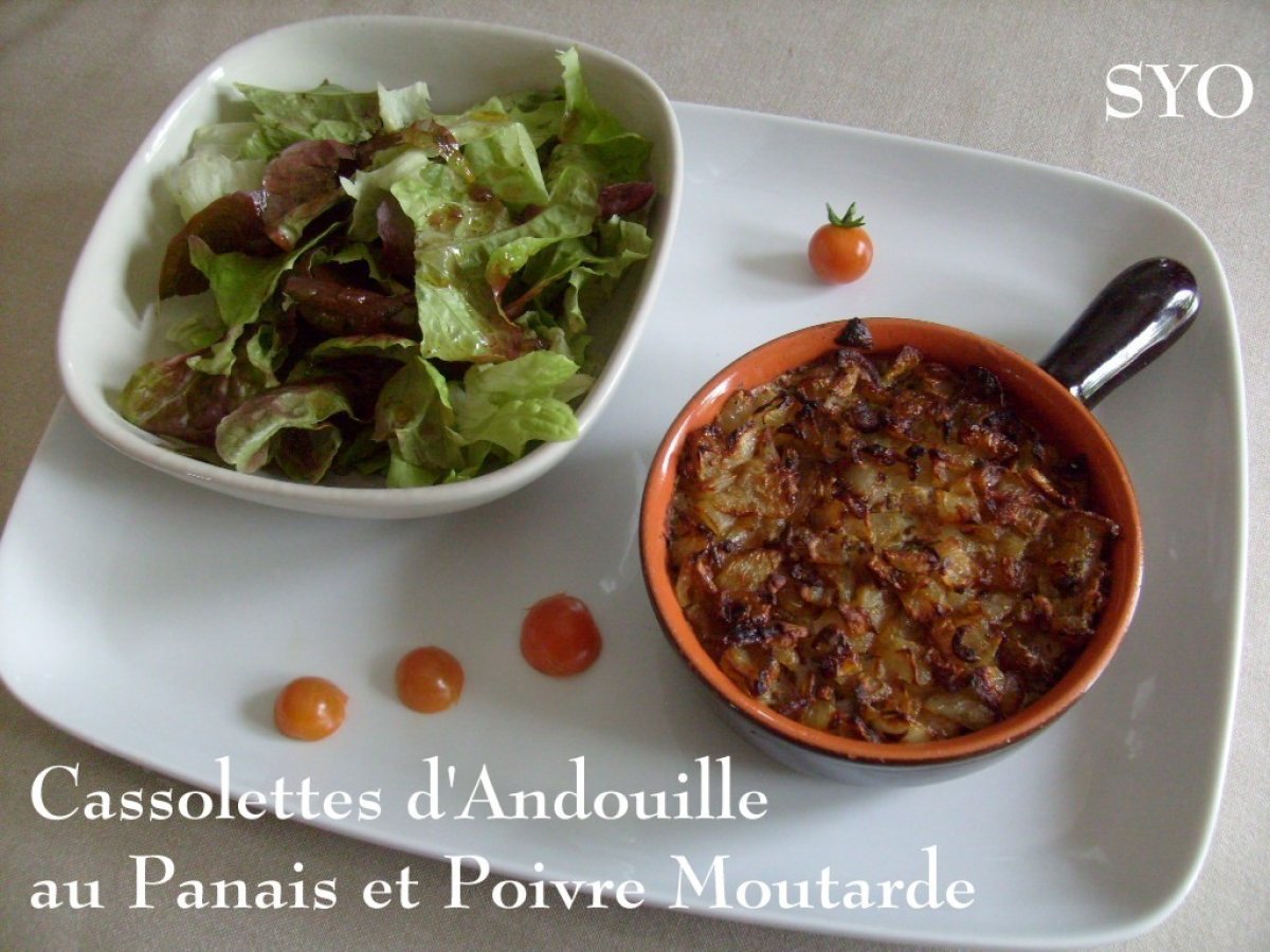 Cette semaine, j'ai composé un nouveau mélange d'épices. Il est relevé à souhait sans être pimenté : Le Poivre de Moutarde du petit Bistro ! Il vous suffit de mettre dans le pilon : moitié poivre 5 baies / moitié graines de moutarde. Vous écrasez finement, puis vous réservez dans un petit bocal. il ne reste plus qu'à lui mettre une étiquette toute mignonne. Pour utiliser ce nouveau mélange, je vous propose ces petites cassolettes d'Andouille au Panais et Poivre Moutarde.