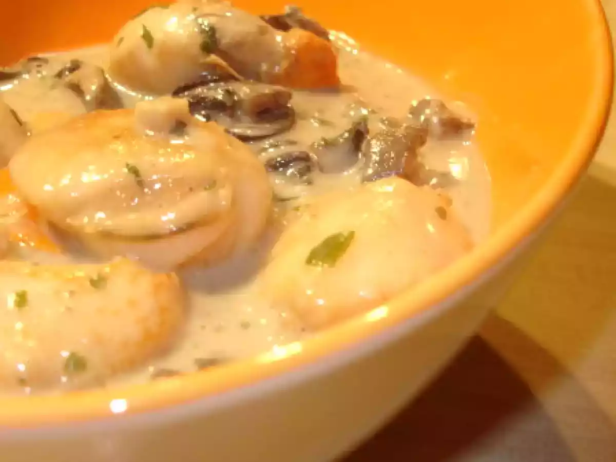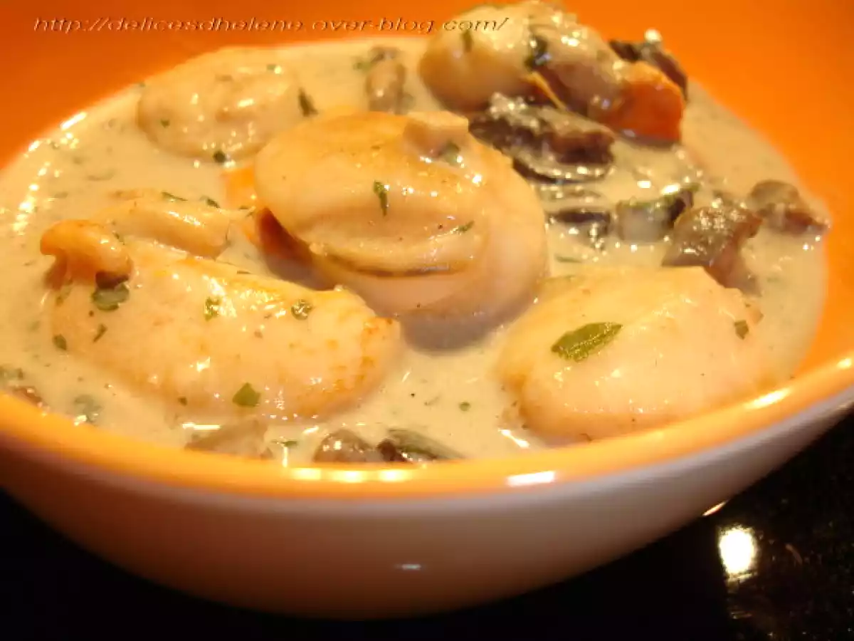 Cassolettes de noix de saint-jacques a la sauce normande PrécédentSuivant Platmoyen30 min350 Kcal Envoyer cette recette à un ami Imprimer cette page Poser une question à l'auteur Publier votre photo de cette recette Ingrédients 4 300g de champignons de Paris 1/2 botte de persil 1 échalote 1 gousse d'ail 1/2 verre de vin blanc (soit environ 12cl) 20cl de fumet de poisson (réalisé avec 2 cuil. à café de fond de poisson et 20 cl d'eau) 8 noix de saint jacques 1 noix de beurre 1 verre de calvados 1 jaune d'oeuf 20cl de crème fraîche liquide sel et poivre