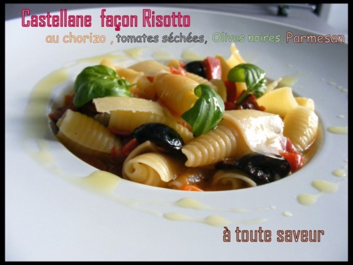 Castellane façon risotto au chorizo, tomates, olives et parmesan votez maintenant Platfacile31 min Envoyer cette recette à un ami Imprimer cette page Poser une question à l'auteur Publier votre photo de cette recette Ingrédients 2 500 g de pâtes 250 g de tomates cerise 20 quartiers de tomates séchées 20 belles feuilles de basilic 100 g de parmesan 1 petit bocal de petit poivrons rouge épluchés et égouttés type piquillos 100 g de chorizo fort 4 cuillères à soupe d?olives noires dénoyautées 2.5 litre de bouillon de volaille 10 cl d'huile d'olive