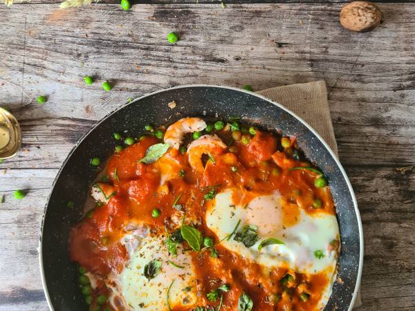 Cette chakchouka combine une base de sauce tomate épicée avec des petits pois et des crevettes sautées, le tout agrémenté d'ail, de graines de moutarde et de piment d'Espelette. Les œufs sont cuits directement dans la sauce pour une texture onctueuse et savoureuse. Le mélange de la douceur des petits pois, du piquant du piment et de la tendreté des crevettes offre une expérience gustative riche, idéale à déguster chaud avec une tranche de pain.