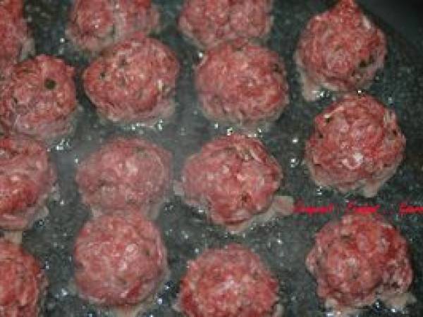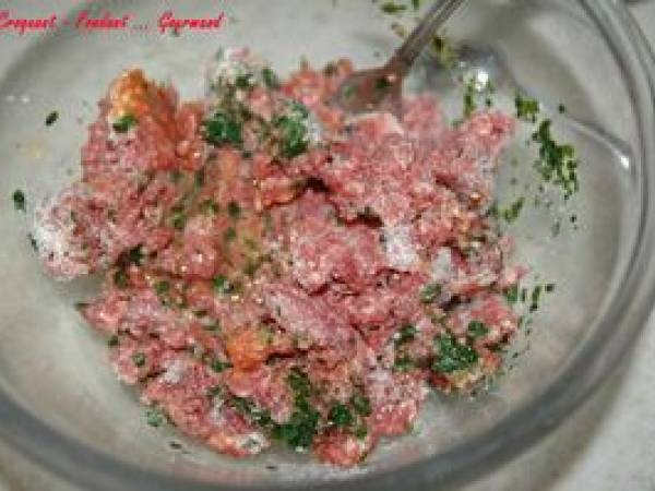 Faire griller les merguez pour qu'elles rendent le gras. Réserver. Pour les boulettes, mélanger soigneusement la viande hachée avec l'oeuf, le parmesan, le persil, les épices et le piment de Cayenne. Saler et poivrer.