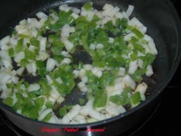 Ajouter oignon, poivron et ail et laisser fondre sans coloration.
