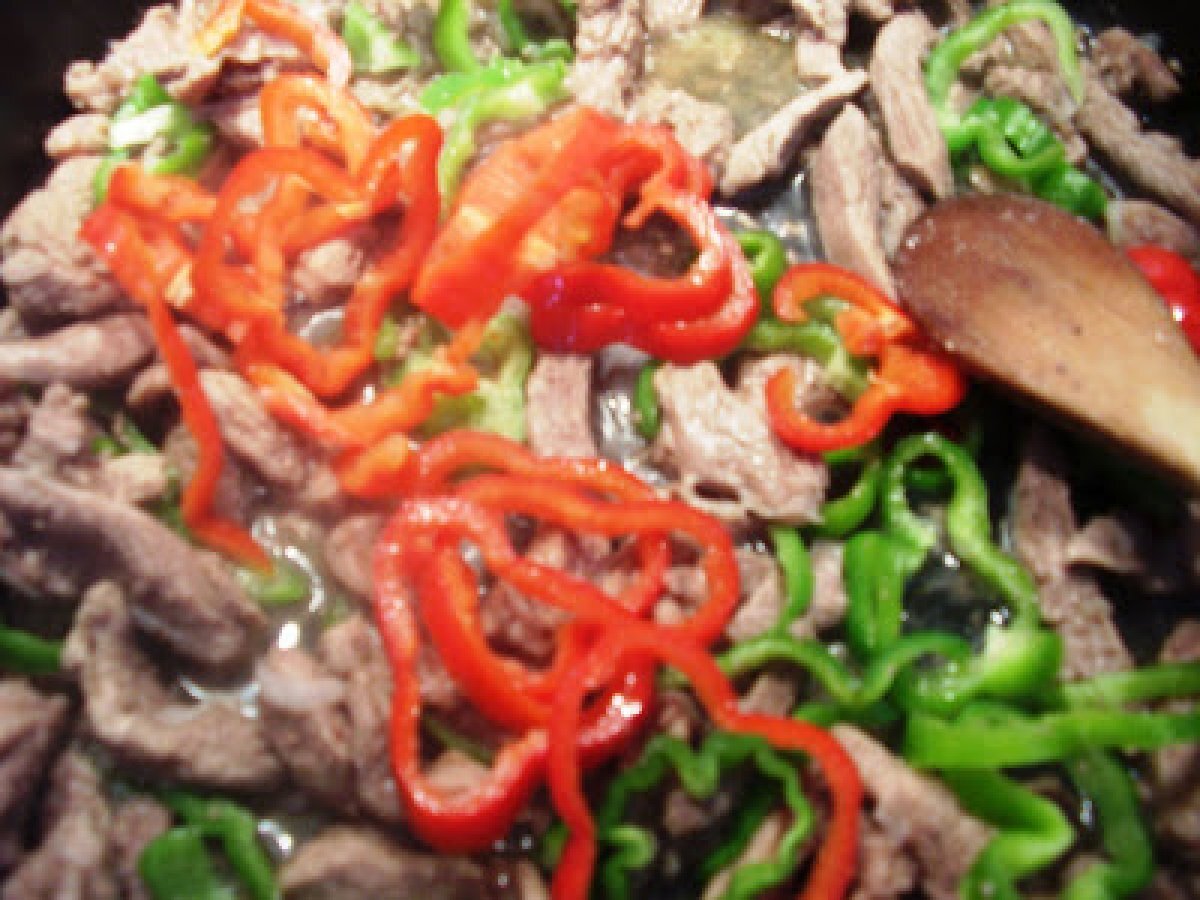 - Couper des rondelles de poivron rouge et vert et les ajouter. Laver et égoutter des champignons en conserve et les ajouter.