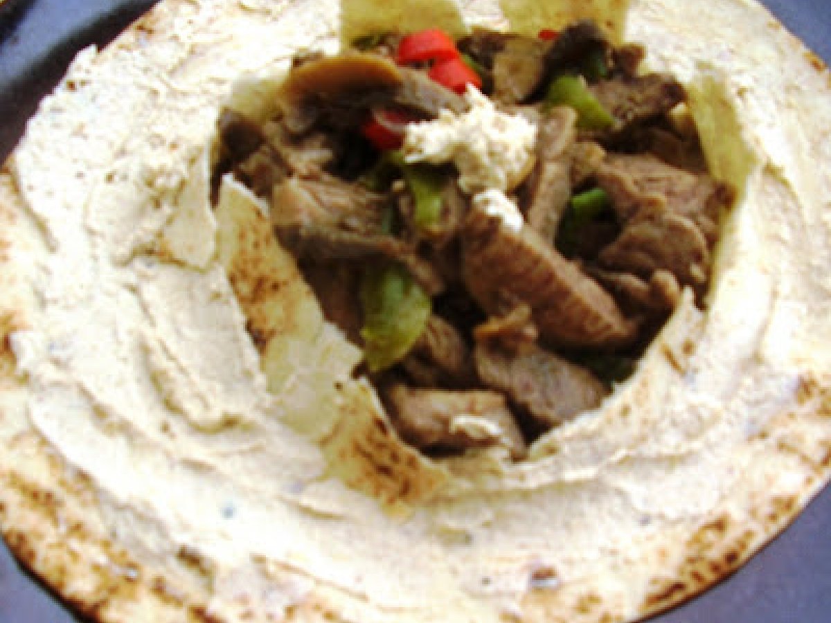 - Prendre du pain pita, le trouer au milieu , badigeonner de baba ghannouj, et remplir de la farce steak-légumes.