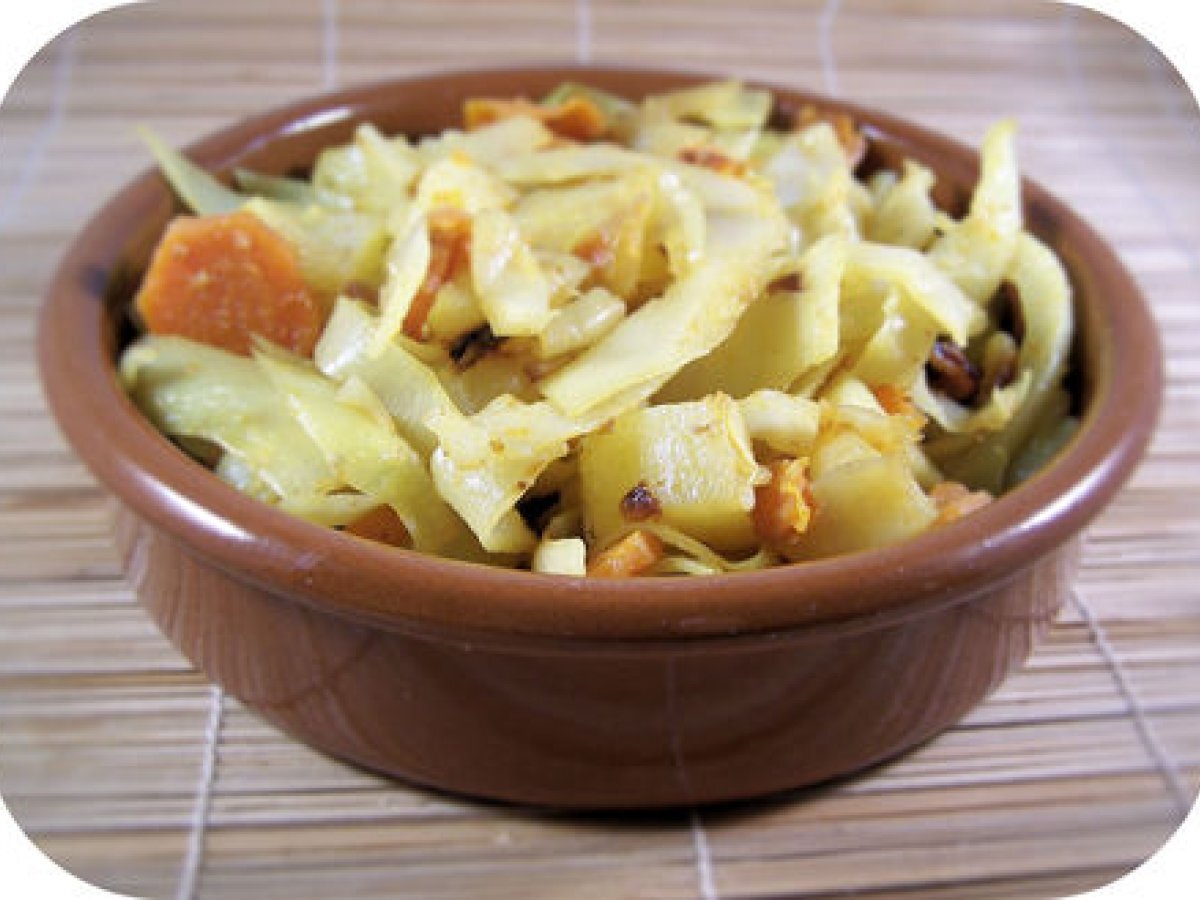 Faire revenir l'oignon 5 minutes dans l'huile chaude. - Ajouter les carottes, le chou et les épices puis cuire une dizaine de minutes à couvert.
