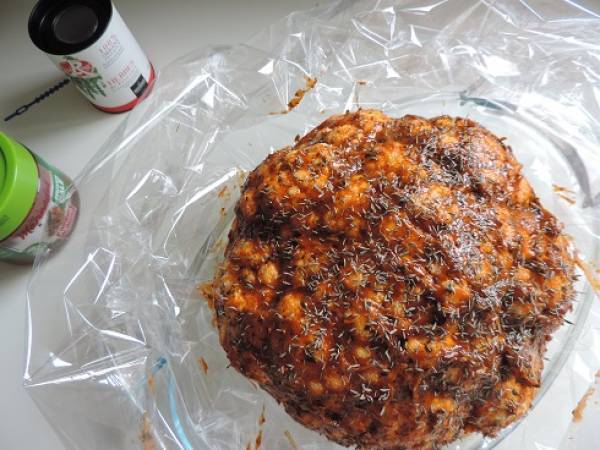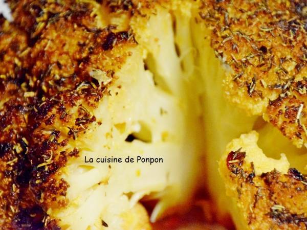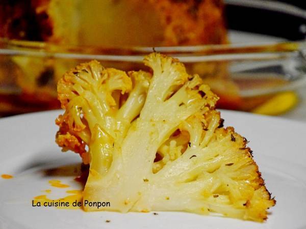 L'idée de faire un chou-fleur entier rôti au four me tentait depuis déjà un certain temps et me voici avec le résultat: tout simplement extrêmement bon, tellement bon qu'on pourrait en faire un plat à lui tout seul! D'ailleurs, je n'ai pas fait grand chose à côté: une petite omelette et un peu de baguette afin de savourer ce délice en entier! Une recette que je vous recommande vivement!