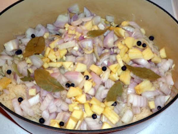 Couper en petit des pas mal d'oignons, un peu d'ail, du laurier et des baies de génevières. Ne salez pas trop....