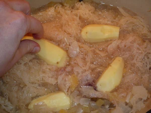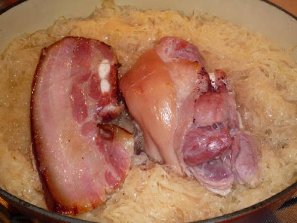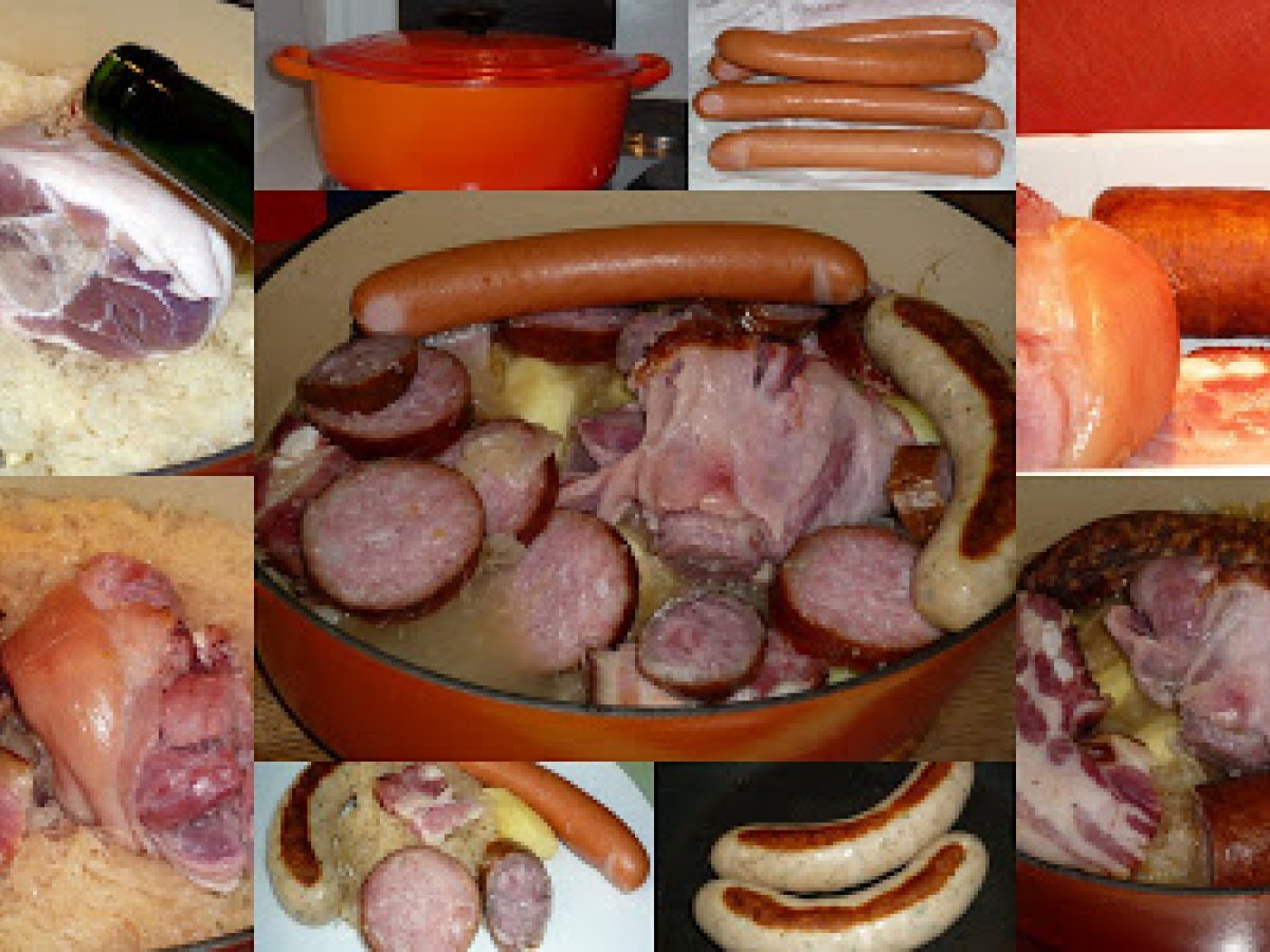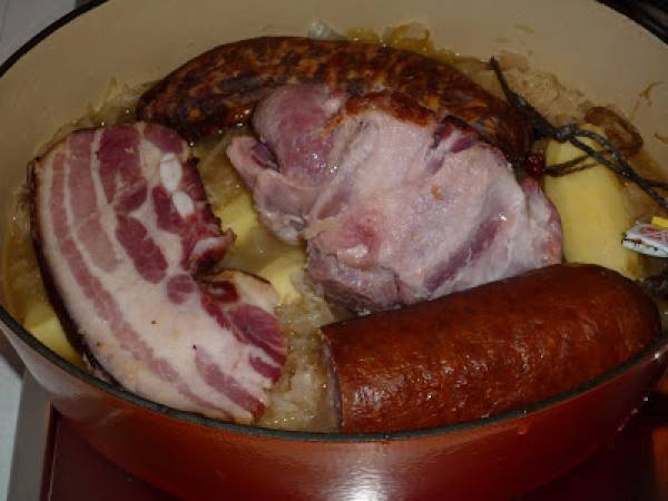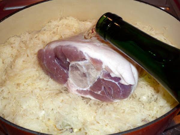 Mettre du Riesling dans ma choucroute, mais vous pouvez aussi ajouter la bière, du jus de pommes, Cidre ou bien du bouillon. Et on enfourne tout à 190° pendant une heure....