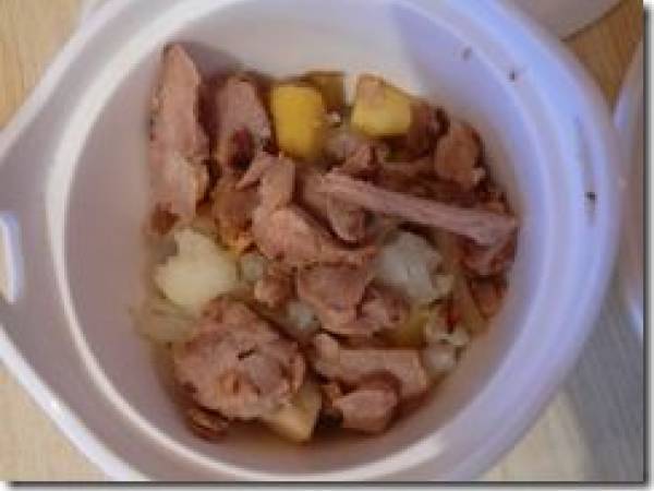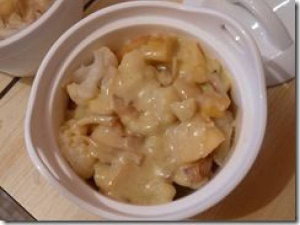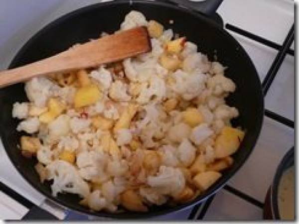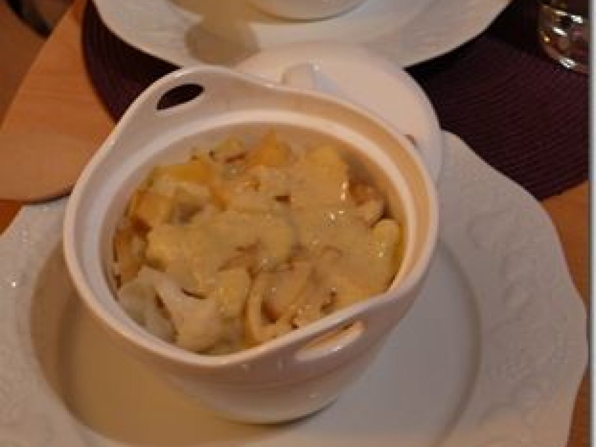 Comme un gratin de chou fleur, pommes, oignon et poulet sauce curry en cocotte !!