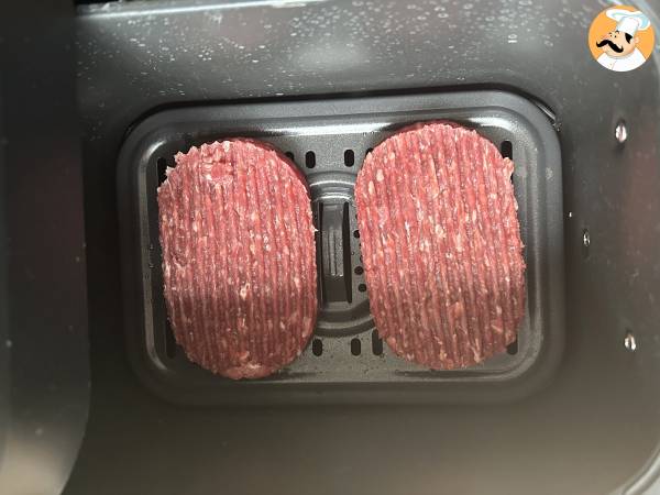 Placer les steaks hachés dans le bac du Air Fryer. Assaisonner de sel, de poivre et d'un spray d'huile d'olive et lancer le Air Fryer pour 10 minutes à 190°c.