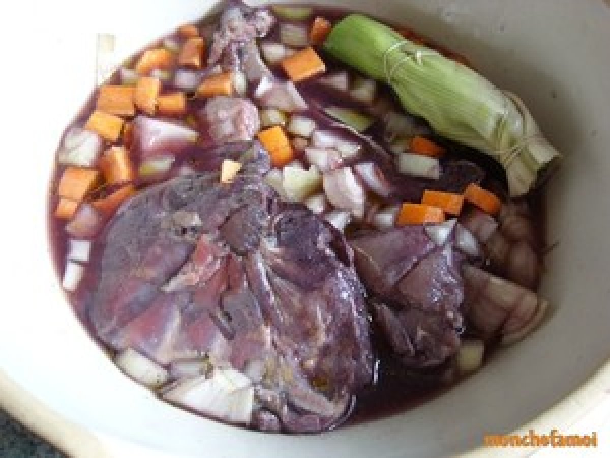 - Mouiller avec le vin rouge et quelques gouttes d'huile d'olive, couvrir d'un papier film et laisser mariner au minimum 12 heures au réfrigérateur.