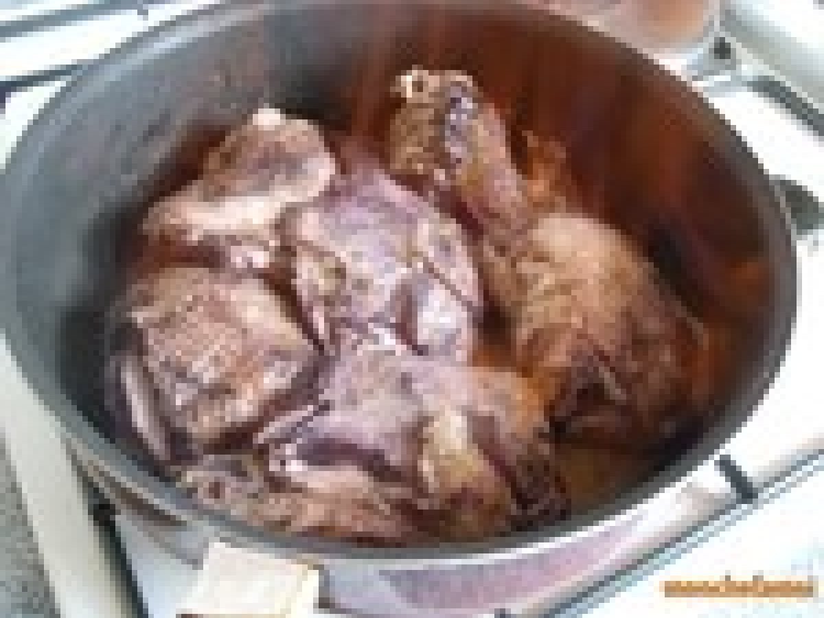 - Egoutter les morceaux de coq et la garniture aromatique. Dans une cocotte fondre la graisse de canard, y rissoler les morceaux de volaille, flamber avec le cognac et ajouter la garniture de la marinade.