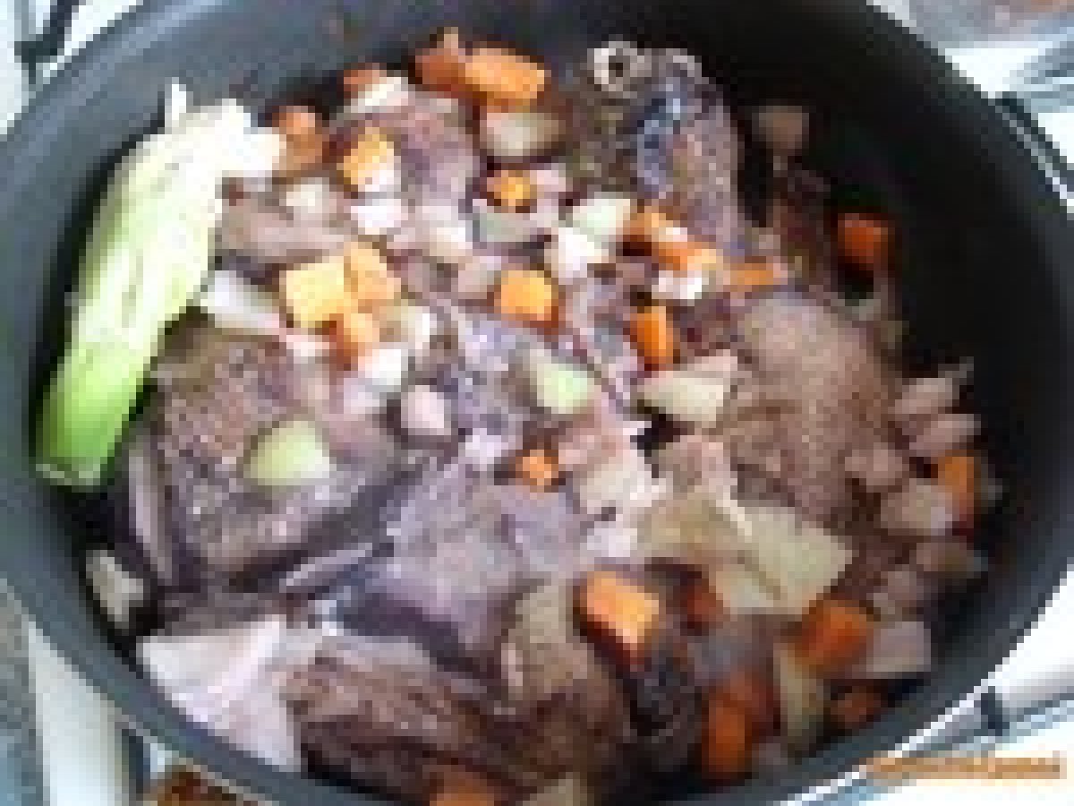 - Vider l'excédent de graisse et saupoudrer de farine (singer), mélanger et passer au four quelques minutes pour cuire la farine. Mouiller avec le vin de la marinade et compléter à hauteur de bouillon ou eau, saler, poivrer.