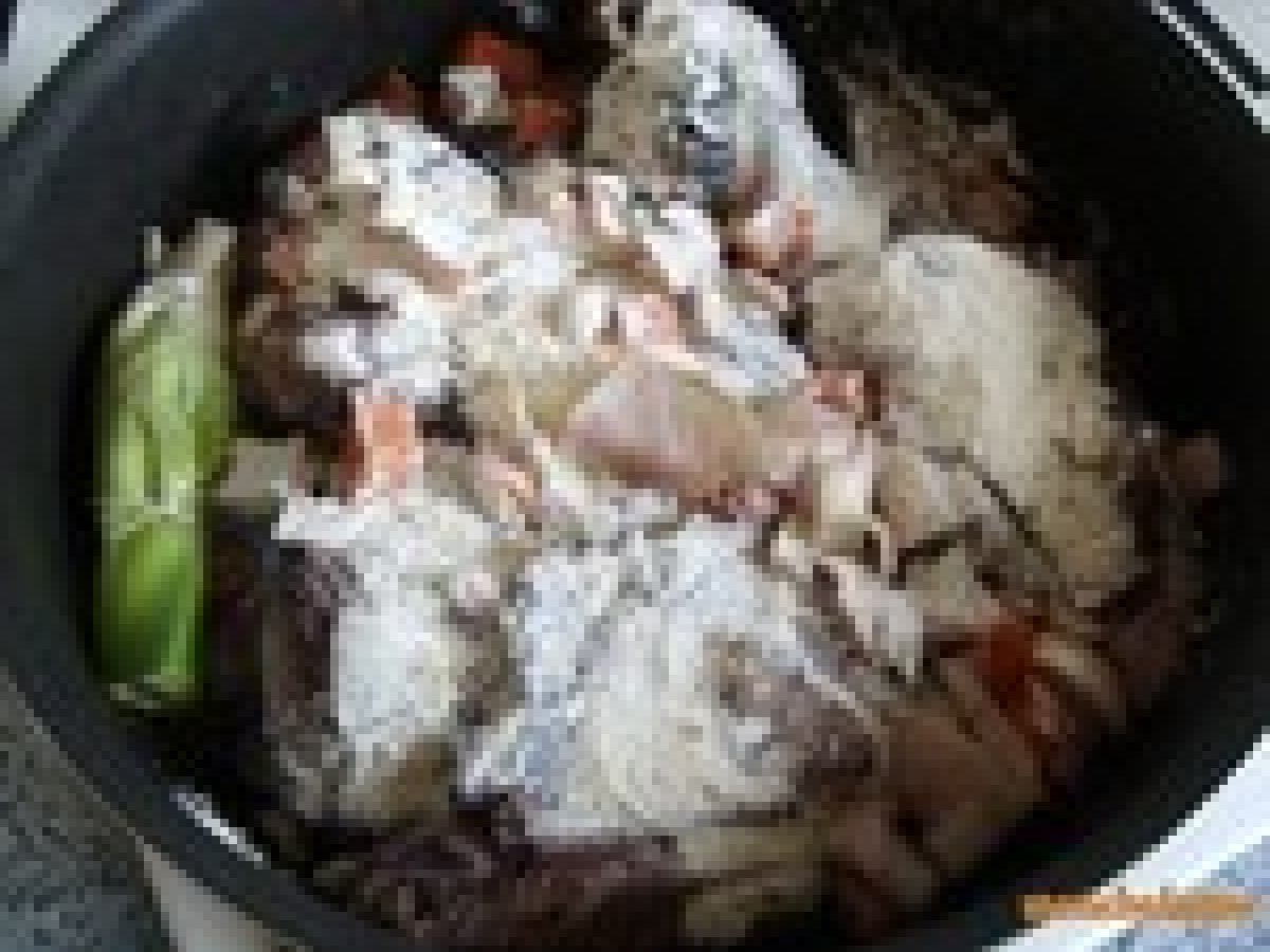 - Retirer les morceaux de coq (décanter) dans le plat de service, ajouter la garniture (lardons, champignons, petits oignons).
