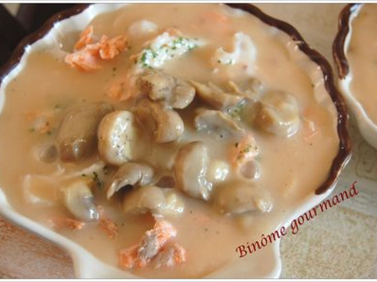 Coquilles de poisson et noix de saint-jacques PrécédentSuivant Platfacile35 min Envoyer cette recette à un ami Imprimer cette page Poser une question à l'auteur Publier votre photo de cette recette Ingrédients 7 1 petit filet de merlan ou cabillaud 1 noix de St Jacques par coquille 1 petite darne de saumon 1 à 2 crevette(s) cuite(s) et décortiquée(s) par coquille selon la grosseur 1 échalote 1 petite boîte de champignons de Paris émincés 1/2 litre de fumet de poisson 1 petit verre de vin blanc sec 3 cuillères à soupe rases de maïzena 1 cuillère à soupe de ketchup ou 1 petite cuillère à café de concentré de tomate 1 cuillère à soupe de crème fraîche gruyère râpé ou de la chapelure sel, poivre, Persil haché ou persillade beurre