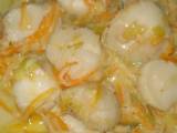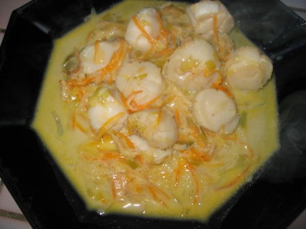 Coquilles saint-jacques à la nage Platfacile35 min247 Kcal Envoyer cette recette à un ami Imprimer cette page Poser une question à l'auteur Publier votre photo de cette recette Ingrédients 4 500 g de noix de Saint-Jacques 100 g de carottes râpées 100 g de céleri rave râpé 1 gros poireau 4 cuillerées à soupe de fumet de poisson 6 cuillerées à soupe de crème fraîche liquide 1 cuillerée à café de gingembre moulu 1/2 litre d'eau poivre beurre