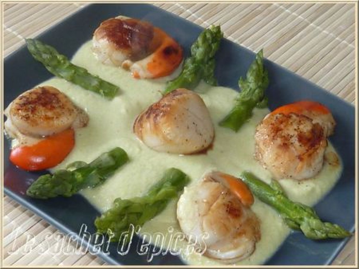 Coquilles saint-jacques aux asperges Platfacile55 min274 Kcal Envoyer cette recette à un ami Imprimer cette page Poser une question à l'auteur Publier votre photo de cette recette Ingrédients 3 24 coquilles Saint-Jacques 1 kg d'asperges vertes 1 citron 1 cuillerée à soupe de vinaigre de Xérès 2 cuillerée à soupe de crème fraîche sel poivre