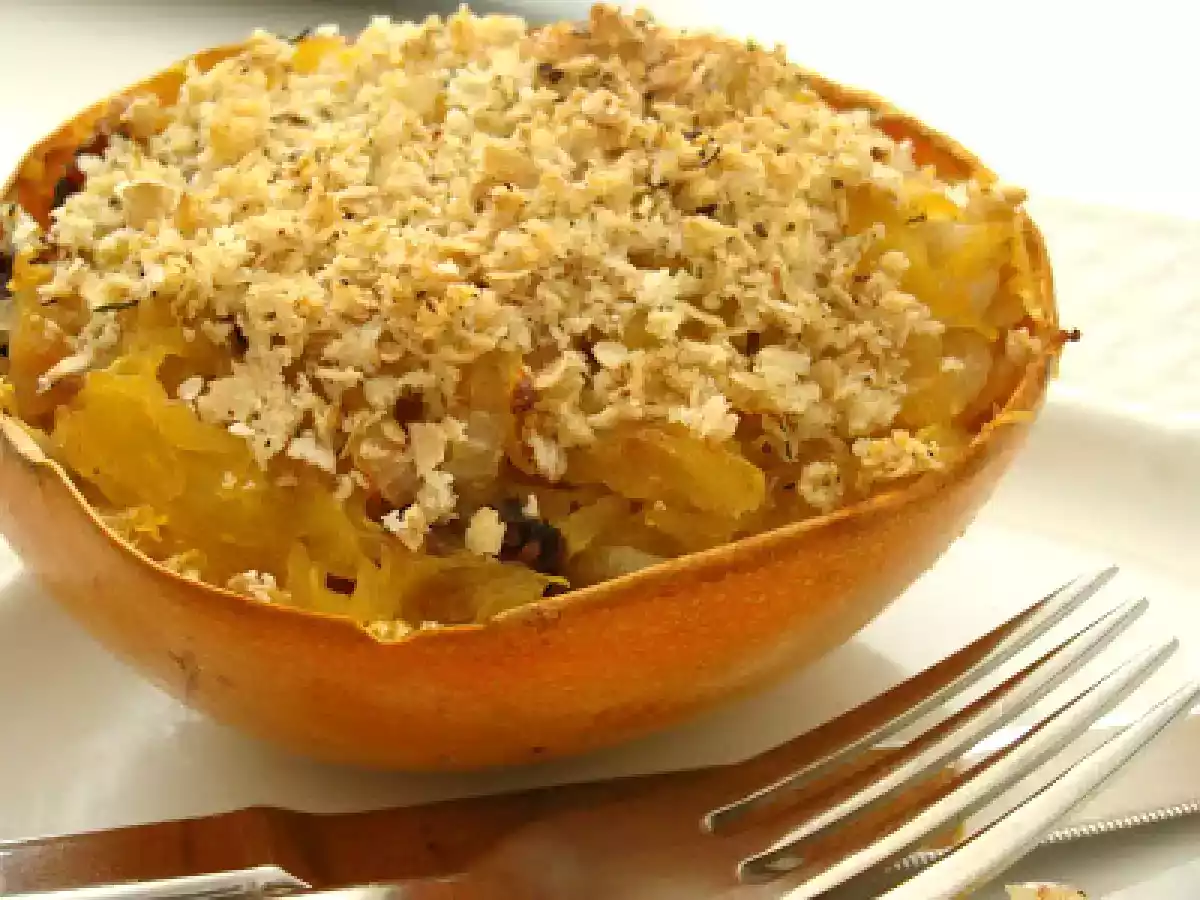 Courge spaghetti farcie aux oignons caramélisés et aux olives - 3 pts Platfacile1 h 15 m Envoyer cette recette à un ami Imprimer cette page Poser une question à l'auteur Publier votre photo de cette recette Ingrédients 2 1 petite courge spaghetti (ronde et pesait à peu près 1 lb) 1 gros oignon en tranches minces de l'huile d'olive une dizaine d'olives noires émincées sel poivre thym 2 cuillères à table de gruau 2 cuillères à table de mie de pain