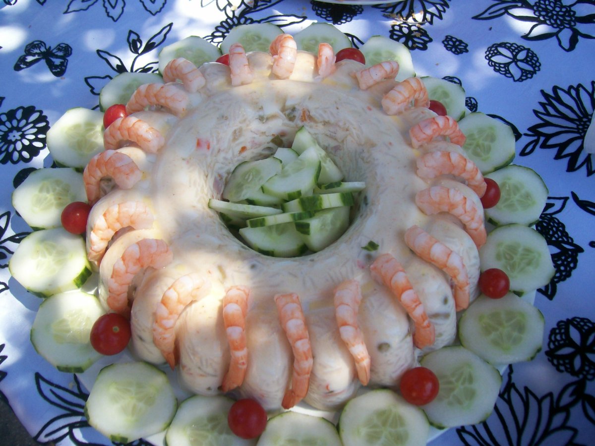 Couronne d'été au riz votez maintenant Platfacile25 min Envoyer cette recette à un ami Imprimer cette page Poser une question à l'auteur Publier votre photo de cette recette Ingrédients 1 250 g à 350 g de riz cuit 1 boite de macédoine(3/4) 2 sachets de gelée au madère 500 ml d'eau 3 oeufs durs 4 à 5 cuillères à soupe de mayonnaise Variante au choix: Dés de jambon Saucisses de Strasbourg Bâtonnets de Surimi Miettes de crabe Crevettes entières en boite Miettes de thon