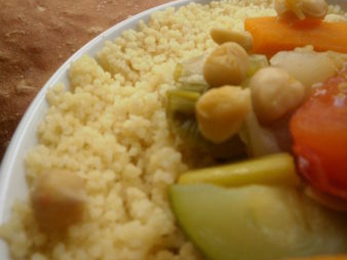 Couscous aux légumes. Platmoyen1 h 5 m769 Kcal Envoyer cette recette à un ami Imprimer cette page Poser une question à l'auteur Publier votre photo de cette recette Ingrédients 2 4 petits poireaux en rondelles 2 courgettes en tronçons 4 petits navets en cubes 3 carottes en gros bâtonnets 2 tomates coupées en quatre 1 poivron vert détaillé en lanières 1 branche de céleri en petits morceaux 1 bouquet garni 300 gr de semoule de couscous 1 cuillère à café de cumin 1 Cuillère à Soupe de ras el hanout La Safranière lorraine 300 gr de pois chiches en conserve 2 Cuillères à Soue d'huile d'olive-harissa-sel-poivre Coût estimé: 9.22Euros€ (4.61€/part)